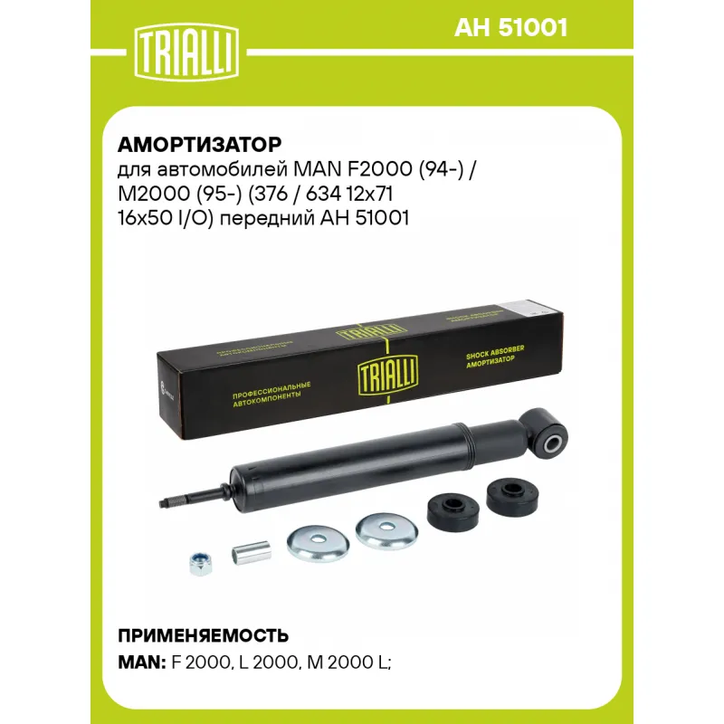 Амортизатор для автомобилей MAN F2000 (94-) / M2000 (95-) (376 / 634 12x71 16x50 I/O) передний Описание: Амортизатор AH 51001 бренда TRIALLI – это устройство для гашения колебаний (демпфирования) и поглощения толчков и ударов, действующих на раму. Особенности AH 51001: - Вид – Масляный; - Тип – Двухтрубный, гидравлический; Для крепления к деталям кузова или подвески используются крепления: верхнее Шток M12x1,5; и нижнее Проушина/сайлентблок. Совместим с: MAN F2000, L2000, M2000.Подбор по VIN-номеру вашего автомобиля - через кнопку 'Задать вопрос'. Специалист проверит применяемость и ответит вам. Преимущества: - Инновационная технология производства; - Контроль качества каждой позиции по чертежам и с помощью 3D модели; - Сальник NOK; - Высокоэффективная система проектирования; - Гарантия до двух лет или 60 000 км пробега; Амортизаторы автомобильные существенно влияют на комфорт вождения, сокращая вибрации от неровностей дороги, что делает поездку более плавной и приятной. Регулярное и своевременное обслуживание амортизаторов помогут продлить их срок службы и обеспечить надёжную работу. Характеристики: Артикул: AH 51001 OEM номера: 81.43701-6804 Товарная линейка: BLACK Количество на автомобиль: 2 Вид амортизатора: Масляный Тип верхнего крепления: Шток Тип нижнего крепления: Проушина/сайлентблок Диаметр корпуса, мм: 45 Диаметр штока, мм: 12.5 Ход штока, мм: 258 Размер резьбы штока: M12x1,5 Тип амортизатора: Двухтрубный, гидравлический Ось (сторона установки): Спереди, слева/справа Дополнительная информация: Упаковка изделия может отличаться от представленной на фото Присоединительная длина 2, мм: 634 Присоединительная длина 1, мм: 376 Гарантийный срок: 2 года/60 000 км Комплектация: Амортизатор передний - 1 шт Гайка крепежная - 1 шт Шайба - 2 шт Подушка резиновая - 2 шт Втулка распорная - 1 шт Гарантия: от 1 года.