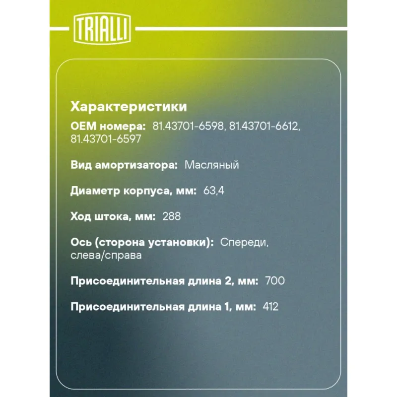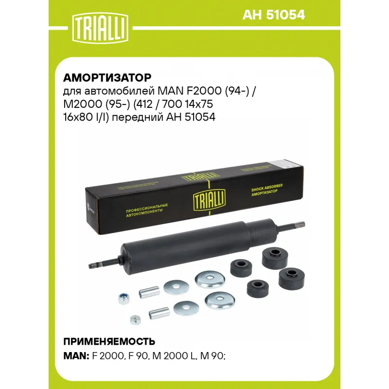 Амортизатор для автомобилей MAN F2000 (94-) / M2000 (95-) (412 / 700 14x75 16x80 I/I) передний Описание: Амортизатор AH 51054 бренда TRIALLI – это устройство для гашения колебаний (демпфирования) и поглощения толчков и ударов, действующих на раму. Особенности AH 51054: - Вид – Масляный; - Тип – Двухтрубный, гидравлический; Для крепления к деталям кузова или подвески используются крепления: верхнее Шток M14x1,5, M16x1,5; и нижнее Корпус/палец. Совместим с: MAN F2000, F90, M2000, M90.Подбор по VIN-номеру вашего автомобиля - через кнопку 'Задать вопрос'. Специалист проверит применяемость и ответит вам. Преимущества: - Инновационная технология производства; - Контроль качества каждой позиции по чертежам и с помощью 3D модели; - Сальник NOK; - Высокоэффективная система проектирования; - Гарантия до двух лет или 60 000 км пробега; Амортизаторы автомобильные существенно влияют на комфорт вождения, сокращая вибрации от неровностей дороги, что делает поездку более плавной и приятной. Регулярное и своевременное обслуживание амортизаторов помогут продлить их срок службы и обеспечить надёжную работу. Характеристики: Артикул: AH 51054 OEM номера: 81.43701-6598, 81.43701-6612, 81.43701-6597 Товарная линейка: BLACK Количество на автомобиль: 2 Вид амортизатора: Масляный Тип верхнего крепления: Шток Тип нижнего крепления: Корпус/палец Диаметр корпуса, мм: 63.4 Диаметр штока, мм: 20 Ход штока, мм: 288 Размер резьбы штока: M14x1,5, M16x1,5 Тип амортизатора: Двухтрубный, гидравлический Ось (сторона установки): Спереди, слева/справа Присоединительная длина 2, мм: 700 Присоединительная длина 1, мм: 412 Гарантийный срок: 2 года/60 000 км Комплектация: Гайка крепежная - 2 шт Амортизатор передний - 1 шт Шайба - 4 шт Подушка резиновая - 4 шт Втулка распорная - 2 шт Гарантия: от 1 года.