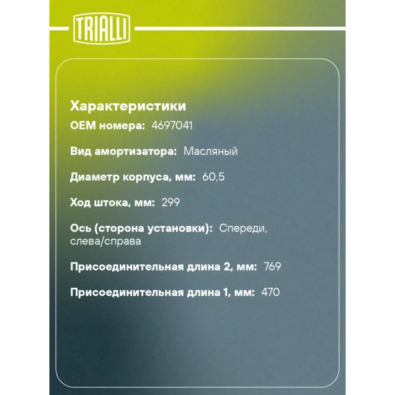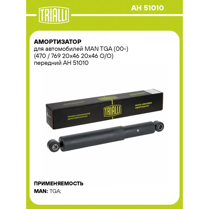 Амортизатор для автомобилей MAN TGA (00-) (470 / 769 20x46 20x46 O/O) передний Описание: Амортизатор AH 51010 бренда TRIALLI – это устройство для гашения колебаний (демпфирования) и поглощения толчков и ударов, действующих на раму. Особенности AH 51010: - Вид – Масляный; - Тип – Двухтрубный, гидравлический; Для крепления к деталям кузова или подвески используются крепления: верхнее Проушина/сайлентблок ; и нижнее Проушина/сайлентблок. Совместим с: MAN TGA.Подбор по VIN-номеру вашего автомобиля - через кнопку 'Задать вопрос'. Специалист проверит применяемость и ответит вам. Преимущества: - Инновационная технология производства; - Контроль качества каждой позиции по чертежам и с помощью 3D модели; - Сальник NOK; - Высокоэффективная система проектирования; - Гарантия до двух лет или 60 000 км пробега; Амортизаторы автомобильные существенно влияют на комфорт вождения, сокращая вибрации от неровностей дороги, что делает поездку более плавной и приятной. Регулярное и своевременное обслуживание амортизаторов помогут продлить их срок службы и обеспечить надёжную работу. Характеристики: Артикул: AH 51010 OEM номера: 4697041 Товарная линейка: BLACK Количество на автомобиль: 2 Вид амортизатора: Масляный Тип верхнего крепления: Проушина/сайлентблок Тип нижнего крепления: Проушина/сайлентблок Диаметр корпуса, мм: 60.5 Диаметр штока, мм: 18 Ход штока, мм: 299 Тип амортизатора: Двухтрубный, гидравлический Ось (сторона установки): Спереди, слева/справа Дополнительная информация: Упаковка изделия может отличаться от представленной на фото Присоединительная длина 2, мм: 769 Присоединительная длина 1, мм: 470 Гарантийный срок: 2 года/60 000 км Комплектация: Амортизатор передний - 1 шт Гарантия: от 1 года.