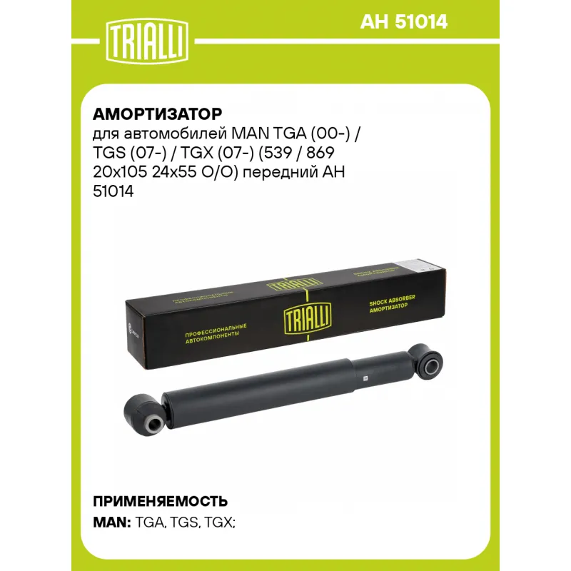 Амортизатор для автомобилей MAN TGA (00-) / TGS (07-) / TGX (07-) (539 / 869 20x105 24x55 O/O) передний Описание: Амортизатор AH 51014 бренда TRIALLI – это устройство для гашения колебаний (демпфирования) и поглощения толчков и ударов, действующих на раму. Особенности AH 51014: - Вид – Масляный; - Тип – Двухтрубный, гидравлический; Для крепления к деталям кузова или подвески используются крепления: верхнее Проушина/сайлентблок ; и нижнее Проушина/сайлентблок. Совместим с: MAN TGA, TGS, TGX.Подбор по VIN-номеру вашего автомобиля - через кнопку 'Задать вопрос'. Специалист проверит применяемость и ответит вам. Преимущества: - Инновационная технология производства; - Контроль качества каждой позиции по чертежам и с помощью 3D модели; - Сальник NOK; - Высокоэффективная система проектирования; - Гарантия до двух лет или 60 000 км пробега; Амортизаторы автомобильные существенно влияют на комфорт вождения, сокращая вибрации от неровностей дороги, что делает поездку более плавной и приятной. Регулярное и своевременное обслуживание амортизаторов помогут продлить их срок службы и обеспечить надёжную работу. Характеристики: Артикул: AH 51014 OEM номера: 81.43702-6014, 81.43702-6005, 81.43702-6004, 81.43702-6078 Товарная линейка: BLACK Количество на автомобиль: 2 Вид амортизатора: Масляный Тип верхнего крепления: Проушина/сайлентблок Тип нижнего крепления: Проушина/сайлентблок Диаметр корпуса, мм: 54 Диаметр штока, мм: 15 Ход штока, мм: 330 Тип амортизатора: Двухтрубный, гидравлический Ось (сторона установки): Спереди, слева/справа Дополнительная информация: Упаковка изделия может отличаться от представленной на фото Присоединительная длина 2, мм: 869 Присоединительная длина 1, мм: 539 Гарантийный срок: 2 года/60 000 км Комплектация: Амортизатор передний - 1 шт Гарантия: от 1 года.