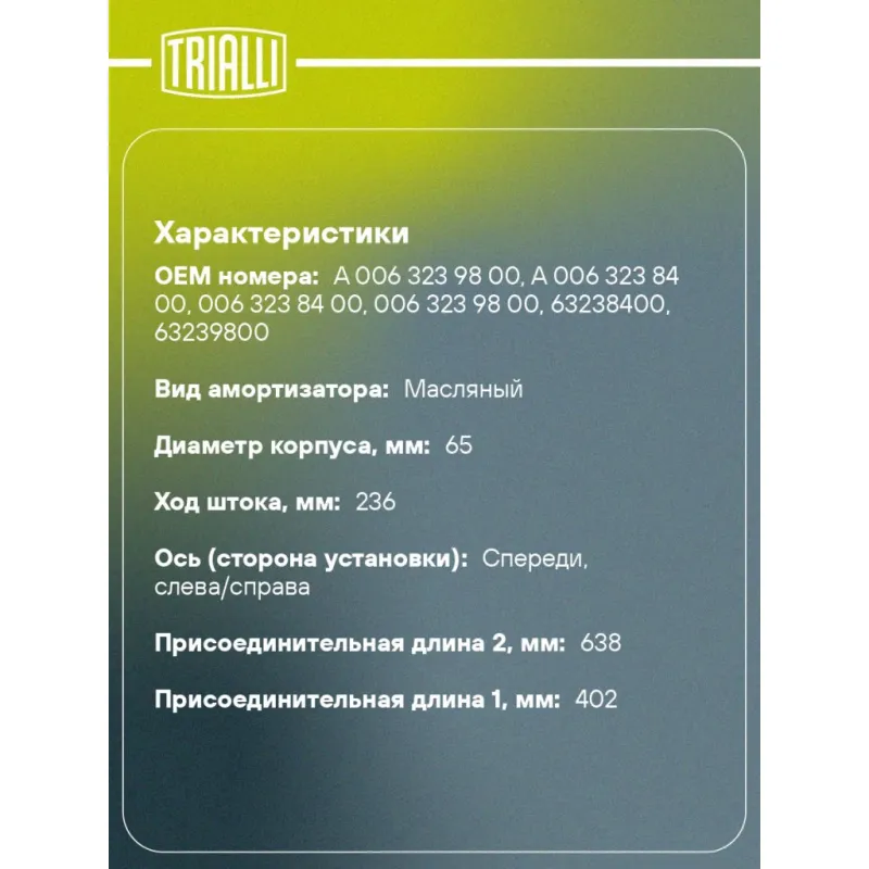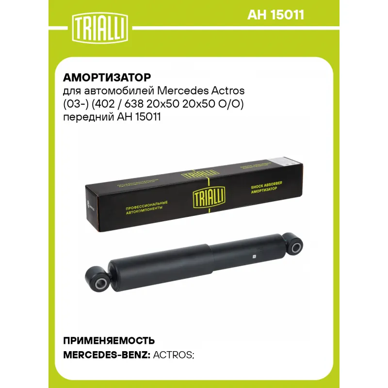 Амортизатор для автомобилей Mercedes Actros (03-) (402 / 638 20x50 20x50 O/O) передний Описание: Амортизатор AH 15011 бренда TRIALLI – это устройство для гашения колебаний (демпфирования) и поглощения толчков и ударов, действующих на раму. Особенности AH 15011: - Вид – Масляный; - Тип – Двухтрубный, гидравлический; Для крепления к деталям кузова или подвески используются крепления: верхнее Проушина/сайлентблок ; и нижнее Проушина/сайлентблок. Совместим с: MERCEDES-BENZ ACTROS.Подбор по VIN-номеру вашего автомобиля - через кнопку 'Задать вопрос'. Специалист проверит применяемость и ответит вам. Преимущества: - Инновационная технология производства; - Контроль качества каждой позиции по чертежам и с помощью 3D модели; - Сальник NOK; - Высокоэффективная система проектирования; - Гарантия до двух лет или 60 000 км пробега; Амортизаторы автомобильные существенно влияют на комфорт вождения, сокращая вибрации от неровностей дороги, что делает поездку более плавной и приятной. Регулярное и своевременное обслуживание амортизаторов помогут продлить их срок службы и обеспечить надёжную работу. Характеристики: Артикул: AH 15011 OEM номера: A 006 323 98 00, A 006 323 84 00, 006 323 84 00, 006 323 98 00, 63238400, 63239800 Товарная линейка: BLACK Количество на автомобиль: 2 Вид амортизатора: Масляный Тип верхнего крепления: Проушина/сайлентблок Тип нижнего крепления: Проушина/сайлентблок Диаметр корпуса, мм: 65 Диаметр штока, мм: 20 Ход штока, мм: 236 Тип амортизатора: Двухтрубный, гидравлический Ось (сторона установки): Спереди, слева/справа Дополнительная информация: Упаковка изделия может отличаться от представленной на фото Присоединительная длина 2, мм: 638 Присоединительная длина 1, мм: 402 Гарантийный срок: 2 года/60 000 км Комплектация: Амортизатор передний - 1 шт Гарантия: от 1 года.