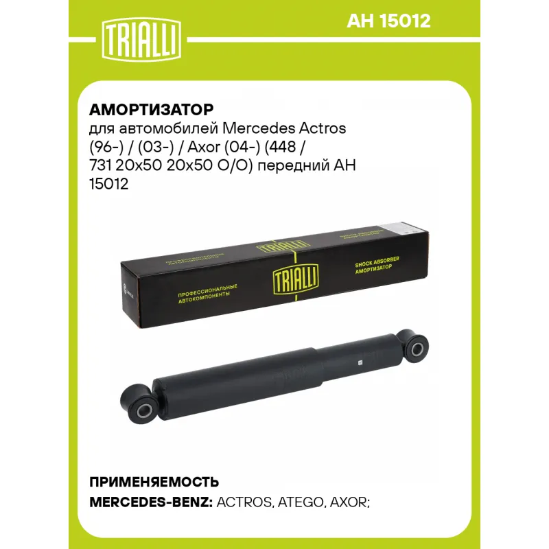 Амортизатор для автомобилей Mercedes Actros (96-) / (03-) / Axor (04-) (448 / 731 20х50 20х50 О/О) передний Описание: Амортизатор AH 15012 бренда TRIALLI – это устройство для гашения колебаний (демпфирования) и поглощения толчков и ударов, действующих на раму. Особенности AH 15012: - Вид – Масляный; - Тип – Двухтрубный, гидравлический; Для крепления к деталям кузова или подвески используются крепления: верхнее Проушина/сайлентблок ; и нижнее Проушина/сайлентблок. Совместим с: MERCEDES-BENZ ACTROS, ATEGO, AXOR, ECONIC.Подбор по VIN-номеру вашего автомобиля - через кнопку 'Задать вопрос'. Специалист проверит применяемость и ответит вам. Преимущества: - Инновационная технология производства; - Контроль качества каждой позиции по чертежам и с помощью 3D модели; - Сальник NOK; - Высокоэффективная система проектирования; - Гарантия до двух лет или 60 000 км пробега; Амортизаторы автомобильные существенно влияют на комфорт вождения, сокращая вибрации от неровностей дороги, что делает поездку более плавной и приятной. Регулярное и своевременное обслуживание амортизаторов помогут продлить их срок службы и обеспечить надёжную работу. Характеристики: Артикул: AH 15012 OEM номера: A 005 323 99 00, A 006 323 83 00, 005 323 99 00, 006 323 83 00, 53239900, 63238300 Товарная линейка: BLACK Количество на автомобиль: 2 Вид амортизатора: Масляный Тип верхнего крепления: Проушина/сайлентблок Тип нижнего крепления: Проушина/сайлентблок Диаметр корпуса, мм: 63.4 Диаметр штока, мм: 20 Ход штока, мм: 283 Тип амортизатора: Двухтрубный, гидравлический Ось (сторона установки): Спереди, слева/справа Дополнительная информация: Упаковка изделия может отличаться от представленной на фото Присоединительная длина 2, мм: 731 Присоединительная длина 1, мм: 448 Гарантийный срок: 2 года/60 000 км Комплектация: Амортизатор передний - 1 шт Гарантия: от 1 года.