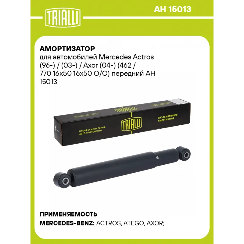 Амортизатор для автомобилей Mercedes Actros (96-) / (03-) / Axor (04-) (462 / 770 16x50 16x50 O/O) передний Описание: Амортизатор AH 15013 бренда TRIALLI – это устройство для гашения колебаний (демпфирования) и поглощения толчков и ударов, действующих на раму. Особенности AH 15013: - Вид – Масляный; - Тип – Двухтрубный, гидравлический; Для крепления к деталям кузова или подвески используются крепления: верхнее Проушина/сайлентблок ; и нижнее Проушина/сайлентблок. Совместим с: MERCEDES-BENZ ACTROS, ATEGO, AXOR, ZETROS.Подбор по VIN-номеру вашего автомобиля - через кнопку 'Задать вопрос'. Специалист проверит применяемость и ответит вам. Преимущества: - Инновационная технология производства; - Контроль качества каждой позиции по чертежам и с помощью 3D модели; - Сальник NOK; - Высокоэффективная система проектирования; - Гарантия до двух лет или 60 000 км пробега; Амортизаторы автомобильные существенно влияют на комфорт вождения, сокращая вибрации от неровностей дороги, что делает поездку более плавной и приятной. Регулярное и своевременное обслуживание амортизаторов помогут продлить их срок службы и обеспечить надёжную работу. Характеристики: Артикул: AH 15013 OEM номера: A 006 323 33 00, A 006 323 39 00, A 006 323 40 00, A 006 323 74 00, 006 323 74 00, 006 323 33 00, 006 323 39 00, 006 323 40 00, 63233300, 63233900, 63234000, 63237400 Товарная линейка: BLACK Количество на автомобиль: 2 Вид амортизатора: Масляный Тип верхнего крепления: Проушина/сайлентблок Тип нижнего крепления: Проушина/сайлентблок Диаметр корпуса, мм: 54 Диаметр штока, мм: 18 Ход штока, мм: 309 Тип амортизатора: Двухтрубный, гидравлический Ось (сторона установки): Спереди, слева/справа Дополнительная информация: Упаковка изделия может отличаться от представленной на фото Присоединительная длина 2, мм: 770.5 Присоединительная длина 1, мм: 461.5 Гарантийный срок: 2 года/60 000 км Комплектация: Амортизатор передний - 1 шт Гарантия: от 1 года.