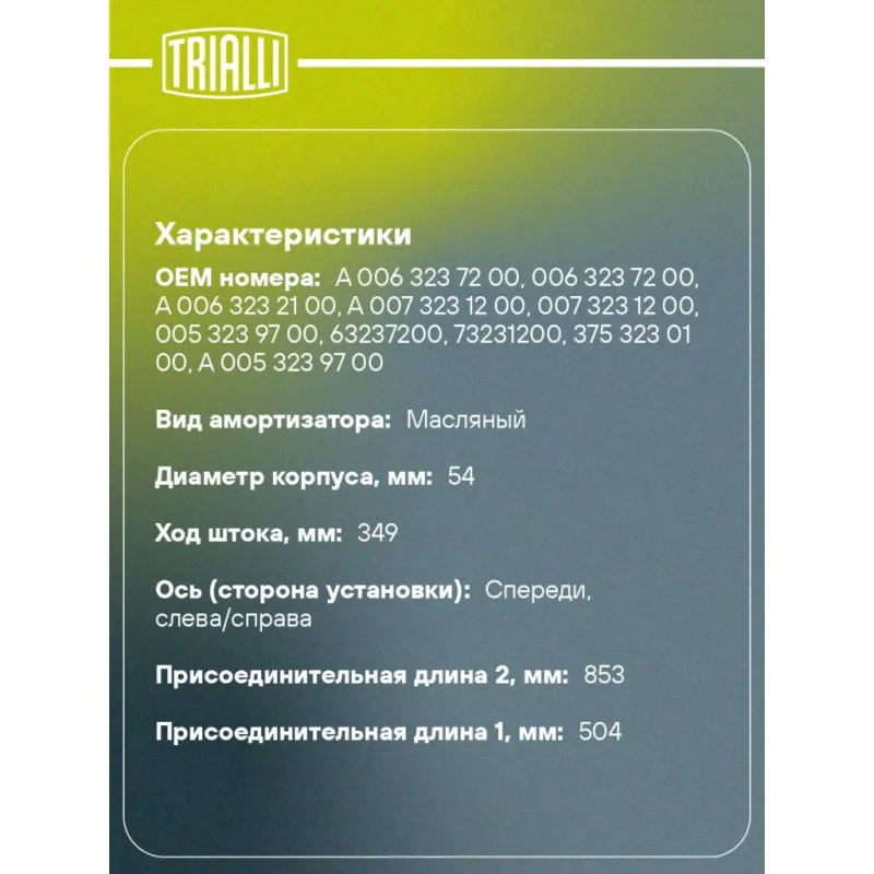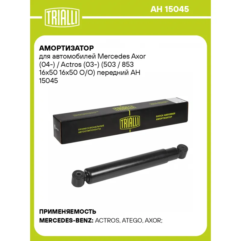 Амортизатор для автомобилей Mercedes Axor (04-) / Actros (03-) (503 / 853 16х50 16х50 O/O) передний Описание: Амортизатор AH 15045 бренда TRIALLI – это устройство для гашения колебаний (демпфирования) и поглощения толчков и ударов, действующих на раму. Особенности AH 15045: - Вид – Масляный; - Тип – Двухтрубный, гидравлический; Для крепления к деталям кузова или подвески используются крепления: верхнее Проушина/сайлентблок ; и нижнее Проушина/сайлентблок. Совместим с: MERCEDES-BENZ ACTROS, ATEGO, AXOR.Подбор по VIN-номеру вашего автомобиля - через кнопку 'Задать вопрос'. Специалист проверит применяемость и ответит вам. Преимущества: - Инновационная технология производства; - Контроль качества каждой позиции по чертежам и с помощью 3D модели; - Сальник NOK; - Высокоэффективная система проектирования; - Гарантия до двух лет или 60 000 км пробега; Амортизаторы автомобильные существенно влияют на комфорт вождения, сокращая вибрации от неровностей дороги, что делает поездку более плавной и приятной. Регулярное и своевременное обслуживание амортизаторов помогут продлить их срок службы и обеспечить надёжную работу. Характеристики: Артикул: AH 15045 OEM номера: A 006 323 72 00, 006 323 72 00, A 006 323 21 00, A 007 323 12 00, 007 323 12 00, 005 323 97 00, 63237200, 73231200, 375 323 01 00, A 005 323 97 00, 006 323 21 00, A 375 323 01 00, 53239700, 63232100 Товарная линейка: BLACK Количество на автомобиль: 2 Вид амортизатора: Масляный Тип верхнего крепления: Проушина/сайлентблок Тип нижнего крепления: Проушина/сайлентблок Диаметр корпуса, мм: 54 Диаметр штока, мм: 16 Ход штока, мм: 349 Тип амортизатора: Двухтрубный, гидравлический Ось (сторона установки): Спереди, слева/справа Присоединительная длина 2, мм: 853 Присоединительная длина 1, мм: 504 Сопутствующий товар: Амортизаторы: AH 15546 Гарантийный срок: 2 года/60 000 км Комплектация: Амортизатор передний - 1 шт Шарнир резинометаллический - 2 шт Гарантия: от 1 года.