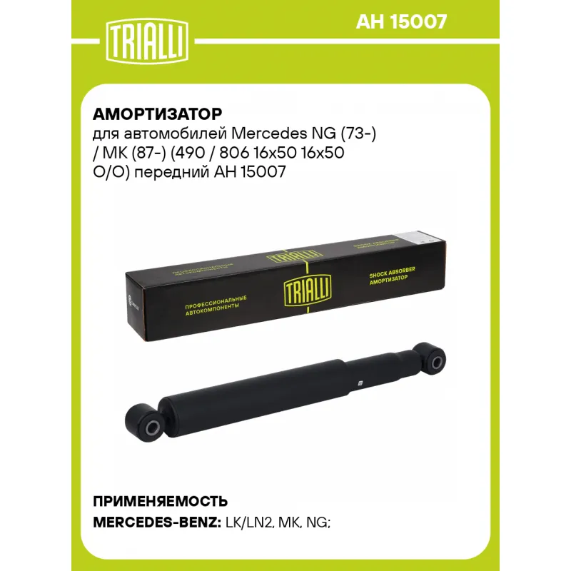 Амортизатор для автомобилей Mercedes NG (73-) / MK (87-) (490 / 806 16x50 16x50 O/O) передний Описание: Амортизатор AH 15007 бренда TRIALLI – это устройство для гашения колебаний (демпфирования) и поглощения толчков и ударов, действующих на раму. Особенности AH 15007: - Вид – Масляный; - Тип – Двухтрубный, гидравлический; Для крепления к деталям кузова или подвески используются крепления: верхнее Проушина/сайлентблок ; и нижнее Проушина/сайлентблок. Совместим с: MERCEDES-BENZ LK/LN2, MK, NG.Подбор по VIN-номеру вашего автомобиля - через кнопку 'Задать вопрос'. Специалист проверит применяемость и ответит вам. Преимущества: - Инновационная технология производства; - Контроль качества каждой позиции по чертежам и с помощью 3D модели; - Сальник NOK; - Высокоэффективная система проектирования; - Гарантия до двух лет или 60 000 км пробега; Амортизаторы автомобильные существенно влияют на комфорт вождения, сокращая вибрации от неровностей дороги, что делает поездку более плавной и приятной. Регулярное и своевременное обслуживание амортизаторов помогут продлить их срок службы и обеспечить надёжную работу. Характеристики: Артикул: AH 15007 OEM номера: A 004 323 34 00, A 003 323 65 00, A 004 323 67 00, A 003 323 66 00, 004 323 67 00, 004 323 34 00, 003 323 65 00, 003 323 66 00, 33236500, 33236600, 43233400, 43236700 Товарная линейка: BLACK Количество на автомобиль: 2 Вид амортизатора: Масляный Тип верхнего крепления: Проушина/сайлентблок Тип нижнего крепления: Проушина/сайлентблок Диаметр корпуса, мм: 51 Диаметр штока, мм: 15 Ход штока, мм: 316 Тип амортизатора: Двухтрубный, гидравлический Ось (сторона установки): Спереди, слева/справа Дополнительная информация: Упаковка изделия может отличаться от представленной на фото Присоединительная длина 2, мм: 806 Присоединительная длина 1, мм: 490 Гарантийный срок: 2 года/60 000 км Комплектация: Амортизатор передний - 1 шт Гарантия: от 1 года.
