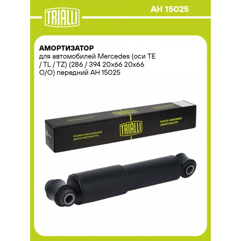 Амортизатор для автомобилей Mercedes (оси TE / TL / TZ) (286 / 394 20х66 20х66 О/О) передний Описание: Амортизатор AH 15025 бренда TRIALLI – это устройство для гашения колебаний (демпфирования) и поглощения толчков и ударов, действующих на раму. Особенности AH 15025: - Вид – Масляный; - Тип – Двухтрубный, гидравлический; Для крепления к деталям кузова или подвески используются крепления: верхнее Проушина/сайлентблок ; и нижнее Проушина/сайлентблок. Совместим с: автомобилей Mercedes (оси TE / TL / TZ)Подбор по VIN-номеру вашего автомобиля - через кнопку 'Задать вопрос'. Специалист проверит применяемость и ответит вам. Преимущества: - Инновационная технология производства; - Контроль качества каждой позиции по чертежам и с помощью 3D модели; - Сальник NOK; - Высокоэффективная система проектирования; - Гарантия до двух лет или 60 000 км пробега; Амортизаторы автомобильные существенно влияют на комфорт вождения, сокращая вибрации от неровностей дороги, что делает поездку более плавной и приятной. Регулярное и своевременное обслуживание амортизаторов помогут продлить их срок службы и обеспечить надёжную работу. Характеристики: Артикул: AH 15025 OEM номера: A 946 326 05 00, 946 326 05 00, JAE3010500500, 550025998, 550027185 Товарная линейка: BLACK Количество на автомобиль: 2 Вид амортизатора: Масляный Тип верхнего крепления: Проушина/сайлентблок Тип нижнего крепления: Проушина/сайлентблок Диаметр корпуса, мм: 70 Диаметр штока, мм: 20 Ход штока, мм: 108 Тип амортизатора: Двухтрубный, гидравлический Ось (сторона установки): Спереди, слева/справа Дополнительная информация: Упаковка изделия может отличаться от представленной на фото Присоединительная длина 2, мм: 394 Присоединительная длина 1, мм: 286 Гарантийный срок: 2 года/60 000 км Комплектация: Амортизатор передний - 1 шт Гарантия: от 1 года.
