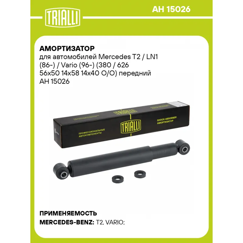 Амортизатор для автомобилей Mercedes T2 / LN1 (86-) / Vario (96-) (380 / 626 56х50 14х58 14х40 O/O) передний Описание: Амортизатор AH 15026 бренда TRIALLI – это устройство для гашения колебаний (демпфирования) и поглощения толчков и ударов, действующих на раму. Особенности AH 15026: - Вид – Масляный; - Тип – Двухтрубный, гидравлический; Для крепления к деталям кузова или подвески используются крепления: верхнее Проушина/сайлентблок ; и нижнее Проушина/сайлентблок. Совместим с: MERCEDES-BENZ T2, VARIO.Подбор по VIN-номеру вашего автомобиля - через кнопку 'Задать вопрос'. Специалист проверит применяемость и ответит вам. Преимущества: - Инновационная технология производства; - Контроль качества каждой позиции по чертежам и с помощью 3D модели; - Сальник NOK; - Высокоэффективная система проектирования; - Гарантия до двух лет или 60 000 км пробега; Амортизаторы автомобильные существенно влияют на комфорт вождения, сокращая вибрации от неровностей дороги, что делает поездку более плавной и приятной. Регулярное и своевременное обслуживание амортизаторов помогут продлить их срок службы и обеспечить надёжную работу. Характеристики: Артикул: AH 15026 OEM номера: A 005 323 19 00, A 005 323 09 00, A 004 323 88 00, A 005 323 03 00, A 004 323 89 00, A 005 323 02 00, 43238800, 43238900, 53230200, 53230300, 53230900, 53231900, 005 323 09 00, 004 323 88 00, 005 323 03 00, 005 323 19 00, 005 323 02 00, 004 323 89 00 Товарная линейка: BLACK Количество на автомобиль: 2 Вид амортизатора: Масляный Тип верхнего крепления: Проушина/сайлентблок Тип нижнего крепления: Проушина/сайлентблок Диаметр корпуса, мм: 41 Диаметр штока, мм: 15 Ход штока, мм: 246 Тип амортизатора: Двухтрубный, гидравлический Ось (сторона установки): Спереди, слева/справа Дополнительная информация: Упаковка изделия может отличаться от представленной на фото Присоединительная длина 2, мм: 626 Присоединительная длина 1, мм: 380 Гарантийный срок: 2 года/60 000 км Комплектация: Амортизатор передний - 1 шт Гарантия: от 1 года.