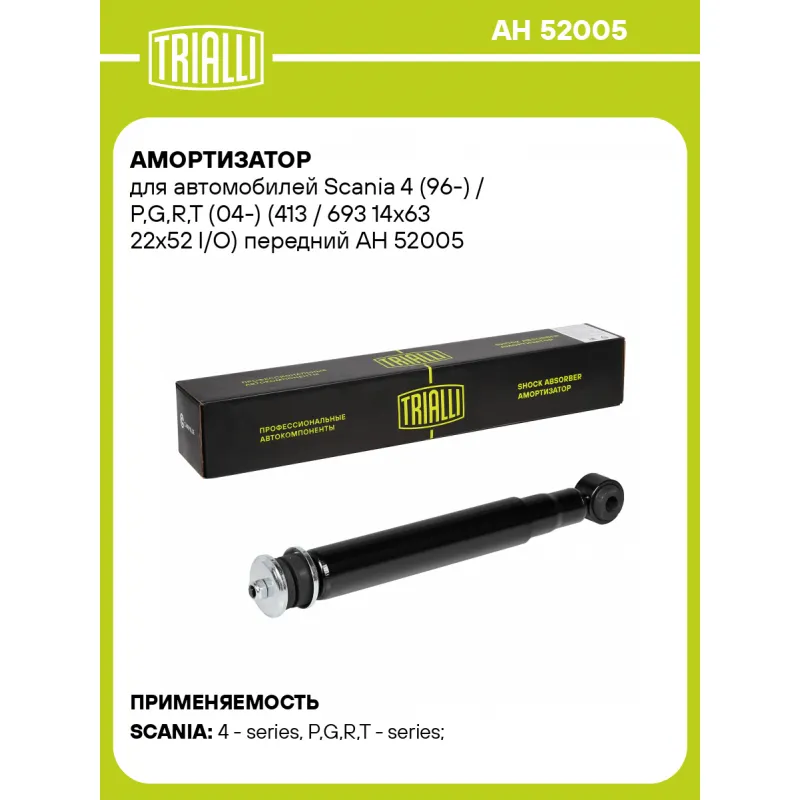 Амортизатор для автомобилей Scania 4 (96-) / P,G,R,T (04-) (413 / 693 14x63 22x52 I/O) передний Описание: Амортизатор AH 52005 бренда TRIALLI – это устройство для гашения колебаний (демпфирования) и поглощения толчков и ударов, действующих на раму. Особенности AH 52005: - Вид – Масляный; - Тип – Двухтрубный, гидравлический; Для крепления к деталям кузова или подвески используются крепления: верхнее Шток M14x1.5; и нижнее Проушина/втулка. Совместим с: SCANIA 4-SERIES, P,G,R,T-SERIES, P-SERIES, R-SERIES.Подбор по VIN-номеру вашего автомобиля - через кнопку 'Задать вопрос'. Специалист проверит применяемость и ответит вам. Преимущества: - Инновационная технология производства; - Контроль качества каждой позиции по чертежам и с помощью 3D модели; - Сальник NOK; - Высокоэффективная система проектирования; - Гарантия до двух лет или 60 000 км пробега; Амортизаторы автомобильные существенно влияют на комфорт вождения, сокращая вибрации от неровностей дороги, что делает поездку более плавной и приятной. Регулярное и своевременное обслуживание амортизаторов помогут продлить их срок службы и обеспечить надёжную работу. Характеристики: Артикул: AH 52005 OEM номера: 1 370 267 Товарная линейка: BLACK Количество на автомобиль: 2 Вид амортизатора: Масляный Тип верхнего крепления: Шток Тип нижнего крепления: Проушина/втулка Диаметр корпуса, мм: 50.8 Диаметр штока, мм: 16 Ход штока, мм: 277 Размер резьбы штока: M14x1.5 Тип амортизатора: Двухтрубный, гидравлический Ось (сторона установки): Спереди, слева/справа Присоединительная длина 2, мм: 684 Присоединительная длина 1, мм: 407 Гарантийный срок: 2 года/60 000 км Комплектация: Амортизатор передний - 1 шт Подушка резиновая - 2 шт Втулка резиновая - 2 шт Шайба - 2 шт Втулка распорная - 2 шт Гайка крепежная - 1 шт Гарантия: от 1 года.
