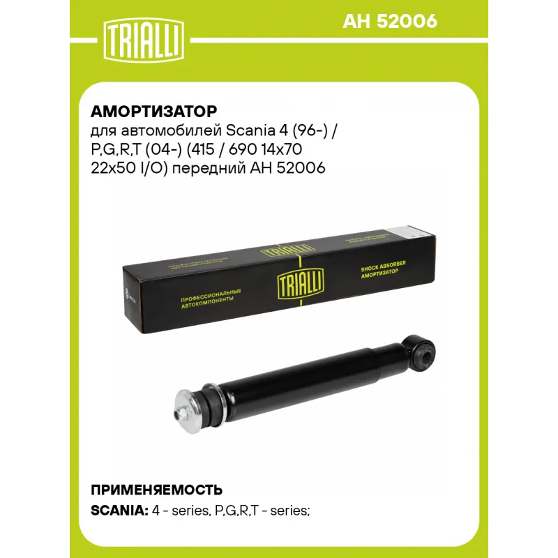 Амортизатор для автомобилей Scania 4 (96-) / P,G,R,T (04-) (415 / 690 14x70 22x50 I/O) передний Описание: Амортизатор AH 52006 бренда TRIALLI – это устройство для гашения колебаний (демпфирования) и поглощения толчков и ударов, действующих на раму. Особенности AH 52006: - Вид – Масляный; - Тип – Двухтрубный, гидравлический; Для крепления к деталям кузова или подвески используются крепления: верхнее Шток M14x1.5; и нижнее Проушина/втулка. Совместим с: SCANIA 4-SERIES, P,G,R,T-SERIES, P-SERIES, R-SERIES.Подбор по VIN-номеру вашего автомобиля - через кнопку 'Задать вопрос'. Специалист проверит применяемость и ответит вам. Преимущества: - Инновационная технология производства; - Контроль качества каждой позиции по чертежам и с помощью 3D модели; - Сальник NOK; - Высокоэффективная система проектирования; - Гарантия до двух лет или 60 000 км пробега; Амортизаторы автомобильные существенно влияют на комфорт вождения, сокращая вибрации от неровностей дороги, что делает поездку более плавной и приятной. Регулярное и своевременное обслуживание амортизаторов помогут продлить их срок службы и обеспечить надёжную работу. Характеристики: Артикул: AH 52006 OEM номера: 1420474, 1861117, 1868264 Товарная линейка: BLACK Количество на автомобиль: 2 Вид амортизатора: Масляный Тип верхнего крепления: Шток Тип нижнего крепления: Проушина/втулка Диаметр корпуса, мм: 54 Диаметр штока, мм: 16 Ход штока, мм: 278 Размер резьбы штока: M14x1.5 Тип амортизатора: Двухтрубный, гидравлический Ось (сторона установки): Спереди, слева/справа Присоединительная длина 2, мм: 685 Присоединительная длина 1, мм: 407 Гарантийный срок: 2 года/60 000 км Комплектация: Амортизатор передний - 1 шт Подушка резиновая - 2 шт Втулка резиновая - 2 шт Шайба - 2 шт Втулка распорная - 2 шт Гайка крепежная - 1 шт Гарантия: от 1 года.