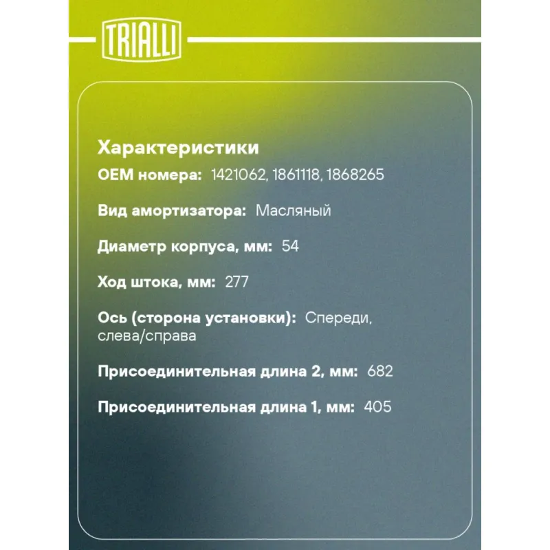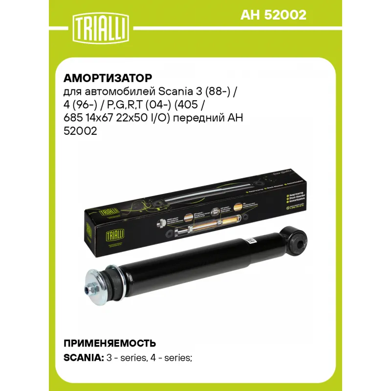 Амортизатор для автомобилей Scania 3 (88-) / 4 (96-) / P,G,R,T (04-) (405 / 685 14x67 22x50 I/O) передний Описание: Амортизатор AH 52002 бренда TRIALLI – это устройство для гашения колебаний (демпфирования) и поглощения толчков и ударов, действующих на раму. Особенности AH 52002: - Вид – Масляный; - Тип – Двухтрубный, гидравлический; Для крепления к деталям кузова или подвески используются крепления: верхнее Шток M14x1.5; и нижнее Проушина/втулка. Совместим с: SCANIA 3-SERIES, 4-SERIES, R-SERIES, P-SERIES, P,G,R,T-SERIES.Подбор по VIN-номеру вашего автомобиля - через кнопку 'Задать вопрос'. Специалист проверит применяемость и ответит вам. Преимущества: - Инновационная технология производства; - Контроль качества каждой позиции по чертежам и с помощью 3D модели; - Сальник NOK; - Высокоэффективная система проектирования; - Гарантия до двух лет или 60 000 км пробега; Амортизаторы автомобильные существенно влияют на комфорт вождения, сокращая вибрации от неровностей дороги, что делает поездку более плавной и приятной. Регулярное и своевременное обслуживание амортизаторов помогут продлить их срок службы и обеспечить надёжную работу. Характеристики: Артикул: AH 52002 OEM номера: 1421062, 1861118, 1868265 Товарная линейка: BLACK Количество на автомобиль: 2 Вид амортизатора: Масляный Тип верхнего крепления: Шток Тип нижнего крепления: Проушина/втулка Диаметр корпуса, мм: 54 Диаметр штока, мм: 16 Ход штока, мм: 277 Размер резьбы штока: M14x1.5 Тип амортизатора: Двухтрубный, гидравлический Ось (сторона установки): Спереди, слева/справа Присоединительная длина 2, мм: 682 Присоединительная длина 1, мм: 405 Гарантийный срок: 2 года/60 000 км Комплектация: Амортизатор передний - 1 шт Подушка резиновая - 2 шт Втулка резиновая - 2 шт Шайба - 2 шт Втулка распорная - 2 шт Гайка крепежная - 1 шт Гарантия: от 1 года.
