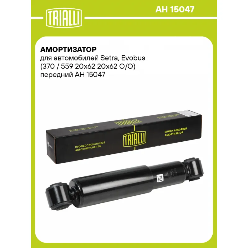 Амортизатор для автомобилей Setra, Evobus (370 / 559 20x62 20x62 O/O) передний Описание: Амортизатор AH 15047 бренда TRIALLI – это устройство для гашения колебаний (демпфирования) и поглощения толчков и ударов, действующих на раму. Особенности AH 15047: - Вид – Масляный; - Тип – Двухтрубный, гидравлический; Для крепления к деталям кузова или подвески используются крепления: верхнее Проушина/сайлентблок ; и нижнее Проушина/сайлентблок. Совместим с: автомобилей Setra, Evobus (370 / 559 20x62 20x62 O/O)Подбор по VIN-номеру вашего автомобиля - через кнопку 'Задать вопрос'. Специалист проверит применяемость и ответит вам. Преимущества: - Инновационная технология производства; - Контроль качества каждой позиции по чертежам и с помощью 3D модели; - Сальник NOK; - Высокоэффективная система проектирования; - Гарантия до двух лет или 60 000 км пробега; Амортизаторы автомобильные существенно влияют на комфорт вождения, сокращая вибрации от неровностей дороги, что делает поездку более плавной и приятной. Регулярное и своевременное обслуживание амортизаторов помогут продлить их срок службы и обеспечить надёжную работу. Характеристики: Артикул: AH 15047 OEM номера: 8231345000, 8231322000, 8 231 345 000 C Товарная линейка: BLACK Количество на автомобиль: 2 Вид амортизатора: Масляный Тип верхнего крепления: Проушина/сайлентблок Тип нижнего крепления: Проушина/сайлентблок Диаметр корпуса, мм: 63,5 Диаметр штока, мм: 20 Ход штока, мм: 180 Тип амортизатора: Двухтрубный, гидравлический Ось (сторона установки): Спереди, слева/справа Дополнительная информация: Упаковка изделия может отличаться от представленной на фото Присоединительная длина 2, мм: 551 Присоединительная длина 1, мм: 371 Гарантийный срок: 2 года/60 000 км Комплектация: Амортизатор передний - 1 шт Гарантия: от 1 года.