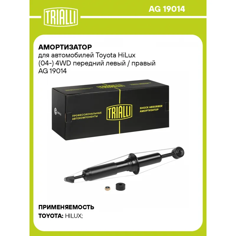Амортизатор для автомобилей Toyota HiLux (04-) 4WD передний левый / правый Описание: Амортизатор AG 19014 бренда TRIALLI – это устройство для гашения колебаний (демпфирования) и поглощения толчков и ударов, действующих на раму. Особенности AG 19014: - Вид – Масляный с газовым подпором низкого давления; - Тип – Двухтрубный, гидравлический; Для крепления к деталям кузова или подвески используются крепления: верхнее Шток M12x1.25; и нижнее Проушина/сайлентблок. Совместим с: TOYOTA HILUX.Подбор по VIN-номеру вашего автомобиля - через кнопку 'Задать вопрос'. Специалист проверит применяемость и ответит вам. Преимущества: - Инновационная технология производства; - Контроль качества каждой позиции по чертежам и с помощью 3D модели; - Сальник NOK; - Высокоэффективная система проектирования; - Гарантия до двух лет или 60 000 км пробега; Амортизаторы автомобильные существенно влияют на комфорт вождения, сокращая вибрации от неровностей дороги, что делает поездку более плавной и приятной. Регулярное и своевременное обслуживание амортизаторов помогут продлить их срок службы и обеспечить надёжную работу. Характеристики: Артикул: AG 19014 OEM номера: 4851009J00, 4851009J90, 4851009K00, 4851009K20, 4851009K30, 4851009K60, 4851009K80, 4851009K90, 485100K100, 485100K130, 485100K140, 485100K180, 485100K330, 485100K340, 485100K350, 485100K360, 48510-09K10, 48510-8Z175 Товарная линейка: BLACK Количество на автомобиль: 2 Вид амортизатора: Масляный с газовым подпором низкого давления Тип верхнего крепления: Шток Тип нижнего крепления: Проушина/сайлентблок Диаметр корпуса, мм: 45 Диаметр штока, мм: 12.5 Ход штока, мм: 130 Размер резьбы штока: M12x1.25 Тип амортизатора: Двухтрубный, гидравлический Ось (сторона установки): Спереди, слева/справа Присоединительная длина 2, мм: 550 Присоединительная длина 1, мм: 420 Сопутствующий товар: Амортизаторы: AG 19515 Гарантийный срок: 2 года/60 000 км Комплектация: Амортизатор передний - 1 шт Шарнир резинометаллический - 1 шт Подушка резиновая - 1 шт Гайка крепежная - 1 шт Гарантия: от 1 года.