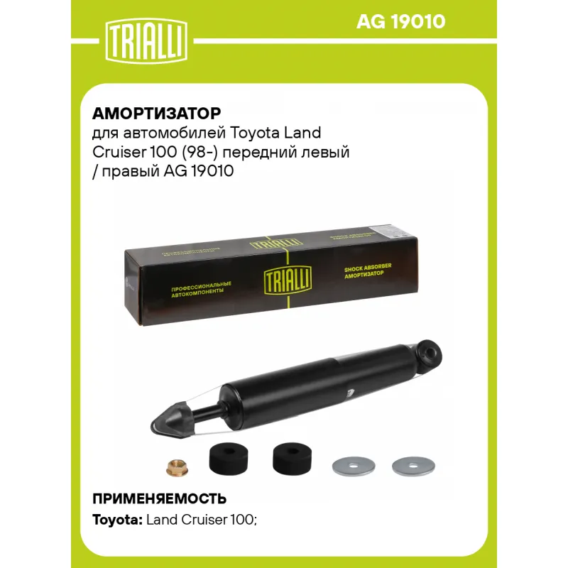 Амортизатор для автомобилей Toyota Land Cruiser 100 (98-) передний левый / правый Описание: Амортизатор AG 19010 бренда TRIALLI – это устройство для гашения колебаний (демпфирования) и поглощения толчков и ударов, действующих на раму. Особенности AG 19010: - Вид – Масляный с газовым подпором низкого давления; - Тип – Двухтрубный, гидравлический; Для крепления к деталям кузова или подвески используются крепления: верхнее Шток M14x1.5; и нижнее Проушина/сайлентблок. Совместим с: LEXUS LX, TOYOTA LAND CRUISER.Подбор по VIN-номеру вашего автомобиля - через кнопку 'Задать вопрос'. Специалист проверит применяемость и ответит вам. Преимущества: - Инновационная технология производства; - Контроль качества каждой позиции по чертежам и с помощью 3D модели; - Сальник NOK; - Высокоэффективная система проектирования; - Гарантия до двух лет или 60 000 км пробега; Амортизаторы автомобильные существенно влияют на комфорт вождения, сокращая вибрации от неровностей дороги, что делает поездку более плавной и приятной. Регулярное и своевременное обслуживание амортизаторов помогут продлить их срок службы и обеспечить надёжную работу. Характеристики: Артикул: AG 19010 OEM номера: 4851069126, 4851069565, 4851160490, 4851160500, 4851160510, 4851160550, 4851169455, 4851169456, 4851169457, 4851169465, 4851169466, 4851169467, 4851169476, 4851169477, 4851169515, 4851069127, 485110G010, 4851169565, 4851169625 Товарная линейка: BLACK Количество на автомобиль: 2 Вид амортизатора: Масляный с газовым подпором низкого давления Тип верхнего крепления: Шток Тип нижнего крепления: Проушина/сайлентблок Диаметр корпуса, мм: 53 Диаметр штока, мм: 14 Ход штока, мм: 154 Размер резьбы штока: M14x1.5 Тип амортизатора: Двухтрубный, гидравлический Ось (сторона установки): Спереди, слева/справа Присоединительная длина 2, мм: 438 Присоединительная длина 1, мм: 284 Сопутствующий товар: Амортизаторы: AG 19511 Гарантийный срок: 2 года/60 000 км Подходит для авто: Toyota Land Cruiser 100 (98-), Land Cruiser 100 (98-) Для проверки применяемости отправьте VIN автомобиля через вкладку "Есть вопросы о товаре?" Комплектация: Амортизатор передний - 1 шт Подушка резиновая - 2 шт Шайба - 2 шт Шарнир резинометаллический - 1 шт Гайка крепежная - 1 шт Гарантия: от 1 года.