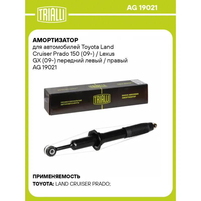 Амортизатор для автомобилей Toyota Land Cruiser Prado 150 (09-) / Lexus GX (09-) передний левый / правый Описание: Амортизатор AG 19021 бренда TRIALLI – это устройство для гашения колебаний (демпфирования) и поглощения толчков и ударов, действующих на раму. Особенности AG 19021: - Вид – Масляный с газовым подпором низкого давления; - Тип – Двухтрубный, гидравлический; Для крепления к деталям кузова или подвески используются крепления: верхнее Шток M12x1.5; и нижнее Проушина/сайлентблок. Совместим с: TOYOTA LAND CRUISER.Подбор по VIN-номеру вашего автомобиля - через кнопку 'Задать вопрос'. Специалист проверит применяемость и ответит вам. Преимущества: - Инновационная технология производства; - Контроль качества каждой позиции по чертежам и с помощью 3D модели; - Сальник NOK; - Высокоэффективная система проектирования; - Гарантия до двух лет или 60 000 км пробега; Амортизаторы автомобильные существенно влияют на комфорт вождения, сокращая вибрации от неровностей дороги, что делает поездку более плавной и приятной. Регулярное и своевременное обслуживание амортизаторов помогут продлить их срок службы и обеспечить надёжную работу. Характеристики: Артикул: AG 19021 OEM номера: 4851035400, 4851060270, 4851069465, 4851060280, 4851060281, 4851069475, 4851080498, 4851080507, 4851060221, 4851080671, 485108Z005, 485108Z052, 4851069595, 4851060220, 4851069645, 4851080494, 4851080495, 4851080497, 4851069476, 4851060300, 4851069495, 4851060360, 4851069565, 4851060200 Товарная линейка: BLACK Количество на автомобиль: 2 Вид амортизатора: Масляный с газовым подпором низкого давления Тип верхнего крепления: Шток Тип нижнего крепления: Проушина/сайлентблок Диаметр корпуса, мм: 45 Диаметр штока, мм: 12.5 Ход штока, мм: 133 Размер резьбы штока: M12x1.5 Тип амортизатора: Двухтрубный, гидравлический Ось (сторона установки): Спереди, слева/справа Присоединительная длина 2, мм: 551 Присоединительная длина 1, мм: 418 Сопутствующий товар: Амортизаторы: AG 19519 Гарантийный срок: 2 года/60 000 км Комплектация: Амортизатор передний - 1 шт Шарнир резинометаллический - 1 шт Шайба - 2 шт Подушка резиновая - 2 шт Гайка крепежная - 1 шт Втулка резиновая - 1 шт Гарантия: от 1 года.