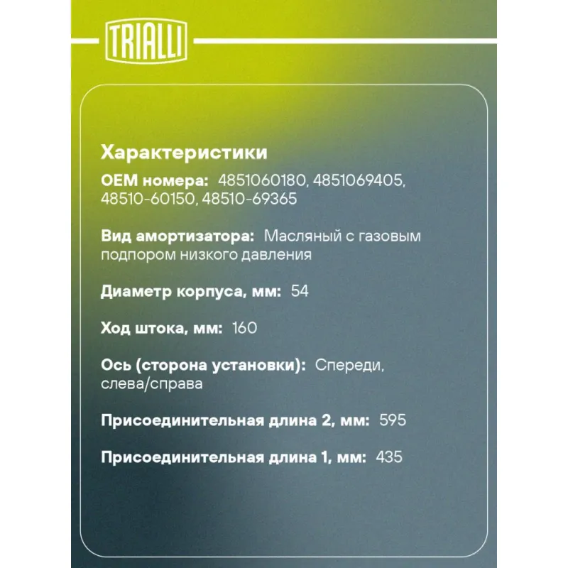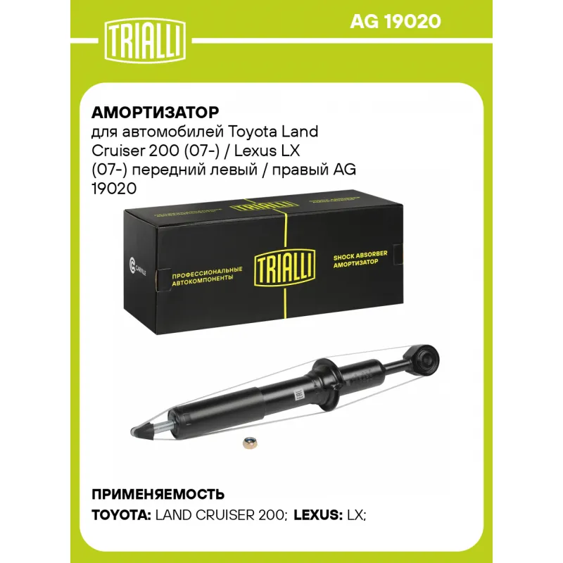 Амортизатор для автомобилей Toyota Land Cruiser 200 (07-) / Lexus LX (07-) передний левый / правый Описание: Амортизатор AG 19020 бренда TRIALLI – это устройство для гашения колебаний (демпфирования) и поглощения толчков и ударов, действующих на раму. Особенности AG 19020: - Вид – Масляный с газовым подпором низкого давления; - Тип – Двухтрубный, гидравлический; Для крепления к деталям кузова или подвески используются крепления: верхнее Шток M14x1.5; и нижнее Проушина/сайлентблок. Совместим с: LEXUS LX, TOYOTA LAND CRUISER.Подбор по VIN-номеру вашего автомобиля - через кнопку 'Задать вопрос'. Специалист проверит применяемость и ответит вам. Преимущества: - Инновационная технология производства; - Контроль качества каждой позиции по чертежам и с помощью 3D модели; - Сальник NOK; - Высокоэффективная система проектирования; - Гарантия до двух лет или 60 000 км пробега; Амортизаторы автомобильные существенно влияют на комфорт вождения, сокращая вибрации от неровностей дороги, что делает поездку более плавной и приятной. Регулярное и своевременное обслуживание амортизаторов помогут продлить их срок службы и обеспечить надёжную работу. Характеристики: Артикул: AG 19020 OEM номера: 4851060180, 4851069405, 48510-60150, 48510-69365 Товарная линейка: BLACK Количество на автомобиль: 2 Вид амортизатора: Масляный с газовым подпором низкого давления Тип верхнего крепления: Шток Тип нижнего крепления: Проушина/сайлентблок Диаметр корпуса, мм: 54 Диаметр штока, мм: 16 Ход штока, мм: 160 Размер резьбы штока: M14x1.5 Тип амортизатора: Двухтрубный, гидравлический Ось (сторона установки): Спереди, слева/справа Присоединительная длина 2, мм: 595 Присоединительная длина 1, мм: 435 Сопутствующий товар: Амортизаторы: AG 19521 Гарантийный срок: 2 года/60 000 км Комплектация: Амортизатор передний - 1 шт Шарнир резинометаллический - 1 шт Гайка крепежная - 1 шт Гарантия: от 1 года.