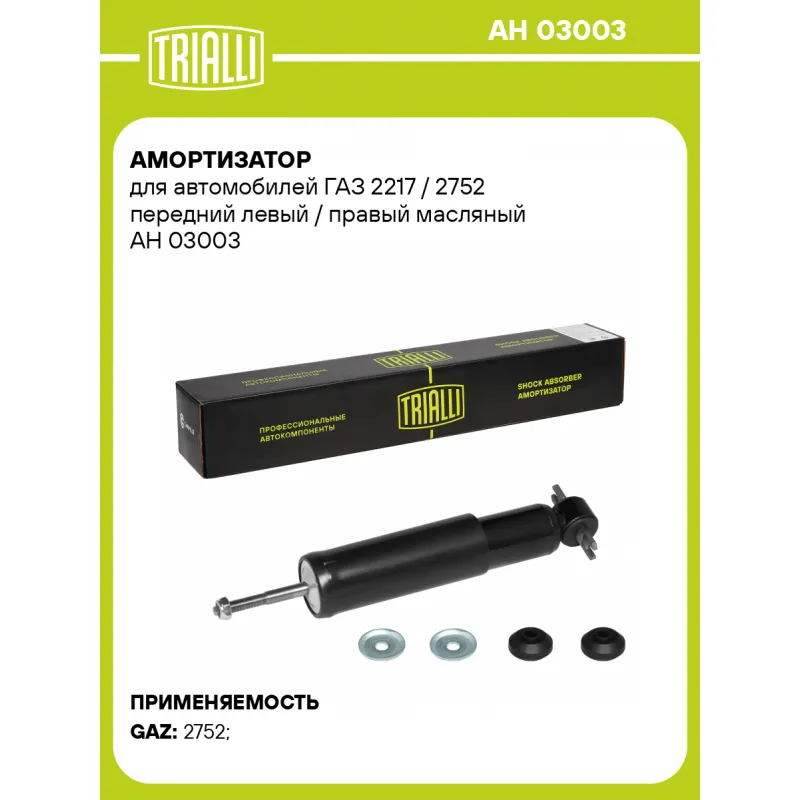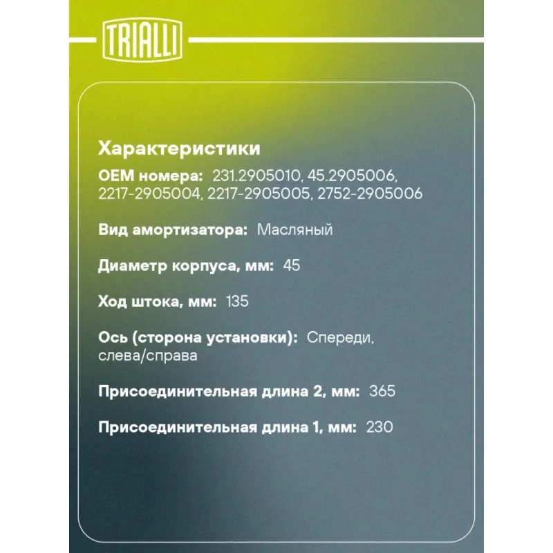 Амортизатор для автомобилей ГАЗ 2217 / 2752 передний левый / правый масляный Описание: Амортизатор бренда TRIALLI служит для гашения колебаний (демпфирования) и поглощения толчков и ударов, действующих на кузов (раму) автомобиля. Особенности: - Вид – Масляный; - Тип – Двухтрубный, гидравлический; Для крепления к деталям кузова автомобиля или подвески используется - верхнее крепление Шток M10x1; и нижнее крепление - Проушина/сайлентблок-поперечина. Применяемость: GAZ SOBOL, VOLGA, GAZELLE, 2752..Подбор по VIN-номеру вашего автомобиля - через кнопку 'Задать вопрос'. Специалист проверит применяемость и ответит вам. Преимущества: - Инновационная технология производства; - Контроль качества: - Дополнительная проверка с помощью 3D модели; - Сальник NOK; - Проверка каждой позиции по чертежам; - Высокоэффективная система проектирования; Амортизаторы автомобильные существенно влияют на комфорт вождения, поглощая удары и вибрации от неровностей дороги, что делает поездку более плавной и приятной.Регулярная проверка и своевременное обслуживание амортизаторов помогут продлить их срок службы и обеспечить надёжную работу. Характеристики: Артикул: AH 03003 OEM номера: 231.2905010, 45.2905006, 2217-2905004, 2217-2905005, 2752-2905006 Товарная линейка: BLACK Количество на автомобиль: 2 Вид амортизатора: Масляный Тип верхнего крепления: Шток Тип нижнего крепления: Проушина/сайлентблок-поперечина Диаметр корпуса, мм: 45 Диаметр штока, мм: 12,5 Ход штока, мм: 135 Размер резьбы штока: M10x1 Тип амортизатора: Двухтрубный, гидравлический Ось (сторона установки): Спереди, слева/справа Дополнительная информация: Упаковка изделия может отличаться от представленной на фото Присоединительная длина 2, мм: 365 Присоединительная длина 1, мм: 230 Сопутствующий товар: Амортизаторы: AG 03003 Гарантийный срок: 2 года/60 000 км Подходит для авто: ГАЗ 2752, 2752 Для проверки применяемости отправьте VIN автомобиля через вкладку "Есть вопросы о товаре?" Комплектация: Амортизатор передний - 1 шт Подушка резиновая - 2 шт Шайба - 2 шт Гайка крепежная - 1 шт Шарнир резинометаллический - 1 шт Гарантия: от 1 года.