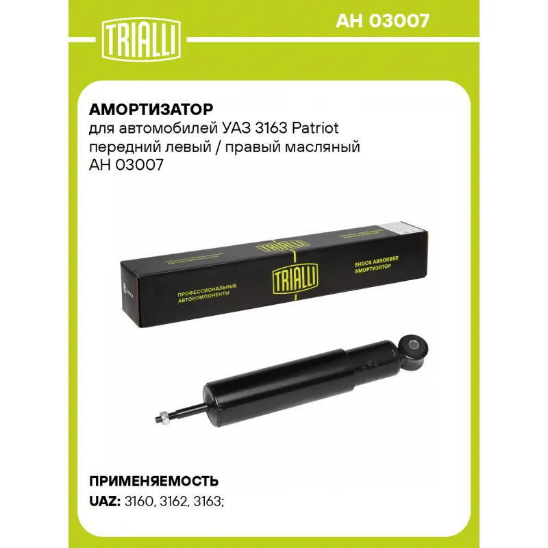 Амортизатор для автомобилей УАЗ 3163 Patriot передний левый / правый масляный Описание: Амортизатор AH 03007 бренда TRIALLI – это устройство для гашения колебаний (демпфирования) и поглощения толчков и ударов, действующих на раму. Особенности AH 03007: - Вид – Масляный; - Тип – Двухтрубный, гидравлический; Для крепления к деталям кузова или подвески используются крепления: верхнее Шток M10x1.5; и нижнее Проушина/сайлентблок. Совместим с: UAZ PATRIOT, PICKUP, 3160, SIMBIR.Подбор по VIN-номеру вашего автомобиля - через кнопку 'Задать вопрос'. Специалист проверит применяемость и ответит вам. Преимущества: - Инновационная технология производства; - Контроль качества каждой позиции по чертежам и с помощью 3D модели; - Сальник NOK; - Высокоэффективная система проектирования; - Гарантия до двух лет или 60 000 км пробега; Амортизаторы автомобильные существенно влияют на комфорт вождения, сокращая вибрации от неровностей дороги, что делает поездку более плавной и приятной. Регулярное и своевременное обслуживание амортизаторов помогут продлить их срок службы и обеспечить надёжную работу. Характеристики: Артикул: AH 03007 OEM номера: 3162-2905404, 3162-2905006, 3163-2905006, 42020.316200-2905006-10, 3162-2905006-11, 3163-2905404, 3163-2905006-10, 316300-2905006-00 Товарная линейка: BLACK Количество на автомобиль: 2 Вид амортизатора: Масляный Тип верхнего крепления: Шток Тип нижнего крепления: Проушина/сайлентблок Диаметр корпуса, мм: 51 Диаметр штока, мм: 15 Ход штока, мм: 170 Размер резьбы штока: M10x1.5 Тип амортизатора: Двухтрубный, гидравлический Ось (сторона установки): Спереди, слева/справа Дополнительная информация: Упаковка изделия может отличаться от представленной на фото Присоединительная длина 2, мм: 469 Присоединительная длина 1, мм: 299 Сопутствующий товар: Амортизаторы: AG 03007,AH 03508, AG 03508 Гарантийный срок: 2 года/60 000 км Подходит для авто: УАЗ 3160 (97-), 3162 (00-), 3163 (Patriot) (05-) Для проверки применяемости отправьте VIN автомобиля через вкладку "Есть вопросы о товаре?" Комплектация: Амортизатор передний - 1 шт Гайка крепежная - 1 шт Шарнир резинометаллический - 1 шт Гарантия: от 1 года.