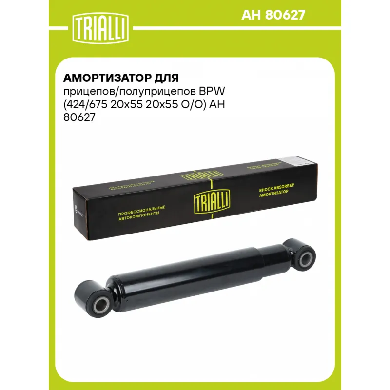 Амортизатор для прицепов/полуприцепов BPW (424/675 20x55 20x55 O/O) Описание: Амортизатор AH 80627 бренда TRIALLI – это устройство для гашения колебаний (демпфирования) и поглощения толчков и ударов, действующих на раму. Особенности AH 80627: - Вид – Масляный; - Тип – Двухтрубный, гидравлический; Для крепления к деталям кузова или подвески используются крепления: верхнее Проушина/сайлентблок ; и нижнее Проушина/сайлентблок. Совместим с прицепами и полуприцепами: Подбор по VIN-номеру вашего автомобиля - через кнопку 'Задать вопрос'. Специалист проверит применяемость и ответит вам. Преимущества: - Инновационная технология производства; - Контроль качества каждой позиции по чертежам и с помощью 3D модели; - Сальник NOK; - Высокоэффективная система проектирования; - Гарантия до двух лет или 60 000 км пробега; Амортизаторы автомобильные существенно влияют на комфорт вождения, сокращая вибрации от неровностей дороги, что делает поездку более плавной и приятной. Регулярное и своевременное обслуживание амортизаторов помогут продлить их срок службы и обеспечить надёжную работу. Характеристики: Артикул: AH 80627 OEM номера: 02.3702.1400 Товарная линейка: BLACK Количество на автомобиль: 2 Вид амортизатора: Масляный Тип верхнего крепления: Проушина/сайлентблок Тип нижнего крепления: Проушина/сайлентблок Диаметр корпуса, мм: 63.4 Диаметр штока, мм: 16 Ход штока, мм: 260 Тип амортизатора: Двухтрубный, гидравлический Ось (сторона установки): Сзади, слева/справа Дополнительная информация: Упаковка изделия может отличаться от представленной на фото Присоединительная длина 2, мм: 666 Присоединительная длина 1, мм: 406 Гарантийный срок: 2 года/60 000 км Комплектация: Амортизатор задний - 1 шт Гарантия: от 1 года.