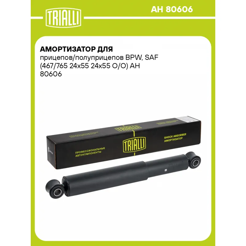 Амортизатор для прицепов/полуприцепов BPW, SAF (467/765 24х55 24х55 O/O) Описание: Амортизатор AH 80606 бренда TRIALLI – это устройство для гашения колебаний (демпфирования) и поглощения толчков и ударов, действующих на раму. Особенности AH 80606: - Вид – Масляный; - Тип – Двухтрубный, гидравлический; Для крепления к деталям кузова или подвески используются крепления: верхнее Проушина/сайлентблок ; и нижнее Проушина/сайлентблок. Совместим с прицепами и полуприцепами: Подбор по VIN-номеру вашего автомобиля - через кнопку 'Задать вопрос'. Специалист проверит применяемость и ответит вам. Преимущества: - Инновационная технология производства; - Контроль качества каждой позиции по чертежам и с помощью 3D модели; - Сальник NOK; - Высокоэффективная система проектирования; - Гарантия до двух лет или 60 000 км пробега; Амортизаторы автомобильные существенно влияют на комфорт вождения, сокращая вибрации от неровностей дороги, что делает поездку более плавной и приятной. Регулярное и своевременное обслуживание амортизаторов помогут продлить их срок службы и обеспечить надёжную работу. Характеристики: Артикул: AH 80606 OEM номера: 2.376.0019.00, 014050, 02.3702.6700 Товарная линейка: BLACK Количество на автомобиль: 2 Вид амортизатора: Масляный Тип верхнего крепления: Проушина/сайлентблок Тип нижнего крепления: Проушина/сайлентблок Диаметр корпуса, мм: 63.4 Диаметр штока, мм: 20 Ход штока, мм: 298 Тип амортизатора: Двухтрубный, гидравлический Ось (сторона установки): Сзади, слева/справа Дополнительная информация: Упаковка изделия может отличаться от представленной на фото Присоединительная длина 2, мм: 765 Присоединительная длина 1, мм: 467 Гарантийный срок: 2 года/60 000 км Комплектация: Амортизатор задний - 1 шт Гарантия: от 1 года.