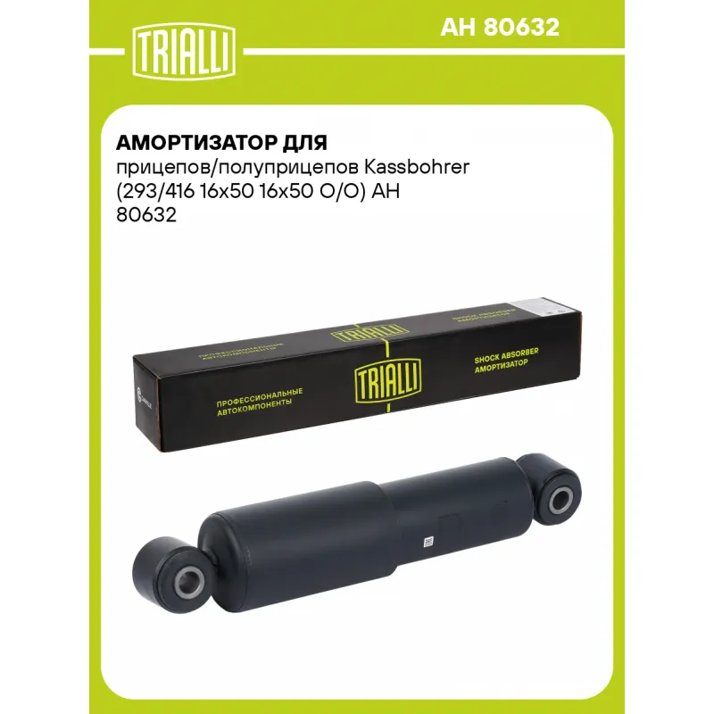 Амортизатор для прицепов/полуприцепов Kassbohrer (293/416 16x50 16x50 О/О) Описание: Амортизатор AH 80632 бренда TRIALLI – это устройство для гашения колебаний (демпфирования) и поглощения толчков и ударов, действующих на раму. Особенности AH 80632: - Вид – Масляный; - Тип – Двухтрубный, гидравлический; Для крепления к деталям кузова или подвески используются крепления: верхнее Проушина/сайлентблок ; и нижнее Проушина/сайлентблок. Совместим с прицепами и полуприцепами: Подбор по VIN-номеру вашего автомобиля - через кнопку 'Задать вопрос'. Специалист проверит применяемость и ответит вам. Преимущества: - Инновационная технология производства; - Контроль качества каждой позиции по чертежам и с помощью 3D модели; - Сальник NOK; - Высокоэффективная система проектирования; - Гарантия до двух лет или 60 000 км пробега; Амортизаторы автомобильные существенно влияют на комфорт вождения, сокращая вибрации от неровностей дороги, что делает поездку более плавной и приятной. Регулярное и своевременное обслуживание амортизаторов помогут продлить их срок службы и обеспечить надёжную работу. Характеристики: Артикул: AH 80632 OEM номера: 8.231.263.000 Товарная линейка: BLACK Количество на автомобиль: 2 Вид амортизатора: Масляный Тип верхнего крепления: Проушина/сайлентблок Тип нижнего крепления: Проушина/сайлентблок Диаметр корпуса, мм: 65 Диаметр штока, мм: 20 Ход штока, мм: 123 Тип амортизатора: Двухтрубный, гидравлический Ось (сторона установки): Сзади, слева/справа Дополнительная информация: Упаковка изделия может отличаться от представленной на фото Присоединительная длина 2, мм: 416 Присоединительная длина 1, мм: 293 Гарантийный срок: 2 года/60 000 км Комплектация: Амортизатор задний - 1 шт Гарантия: от 1 года.