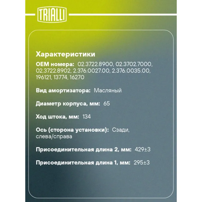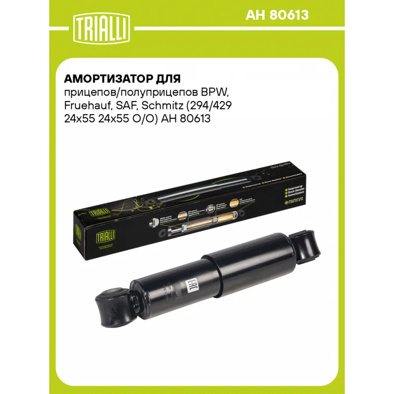 Амортизатор для прицепов/полуприцепов BPW, Fruehauf, SAF, Schmitz (294/429 24х55 24х55 О/О) Описание: Амортизатор AH 80613 бренда TRIALLI – это устройство для гашения колебаний (демпфирования) и поглощения толчков и ударов, действующих на раму. Особенности AH 80613: - Вид – Масляный; - Тип – Двухтрубный, гидравлический; Для крепления к деталям кузова или подвески используются крепления: верхнее Проушина/сайлентблок ; и нижнее Проушина/сайлентблок. Совместим с: Подбор по VIN-номеру вашего автомобиля - через кнопку 'Задать вопрос'. Специалист проверит применяемость и ответит вам. Преимущества: - Инновационная технология производства; - Контроль качества каждой позиции по чертежам и с помощью 3D модели; - Сальник NOK; - Высокоэффективная система проектирования; - Гарантия до двух лет или 60 000 км пробега; Амортизаторы автомобильные существенно влияют на комфорт вождения, сокращая вибрации от неровностей дороги, что делает поездку более плавной и приятной. Регулярное и своевременное обслуживание амортизаторов помогут продлить их срок службы и обеспечить надёжную работу. Характеристики: Артикул: AH 80613 OEM номера: 02.3722.8900, 02.3702.7000, 02.3722.8902, 2.376.0027.00, 2.376.0035.00, 196121, 13774, 16270 Товарная линейка: BLACK Количество на автомобиль: 2 Вид амортизатора: Масляный Тип верхнего крепления: Проушина/сайлентблок Тип нижнего крепления: Проушина/сайлентблок Диаметр корпуса, мм: 65 Диаметр штока, мм: 20 Ход штока, мм: 134 Тип амортизатора: Двухтрубный, гидравлический Ось (сторона установки): Сзади, слева/справа Дополнительная информация: Упаковка изделия может отличаться от представленной на фото Присоединительная длина 2, мм: 429±3 Присоединительная длина 1, мм: 295±3 Гарантийный срок: 2 года/60 000 км Комплектация: Амортизатор задний - 1 шт Шарнир резинометаллический - 2 шт Гарантия: от 1 года.
