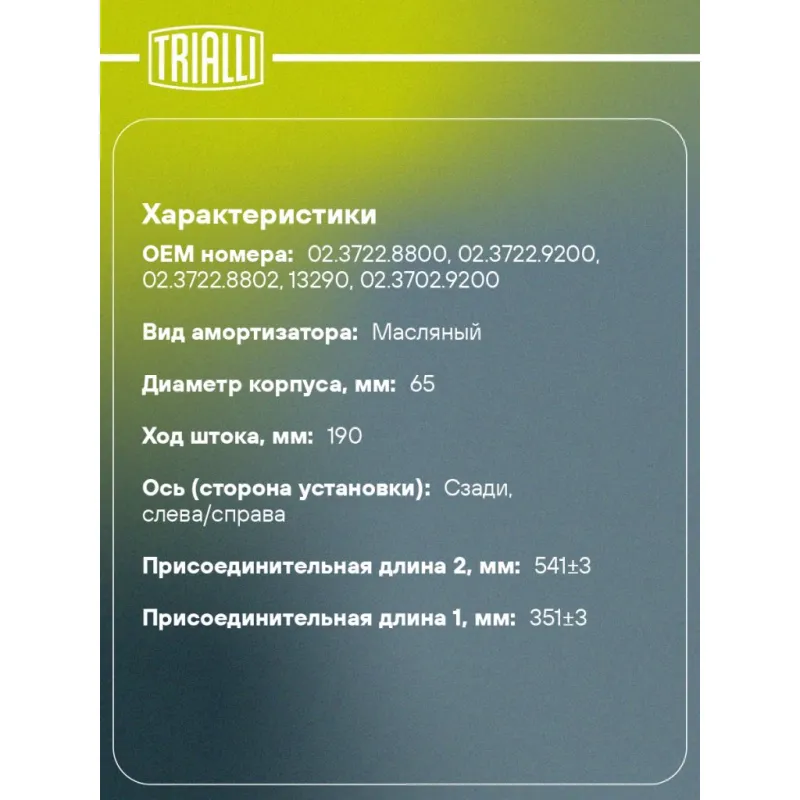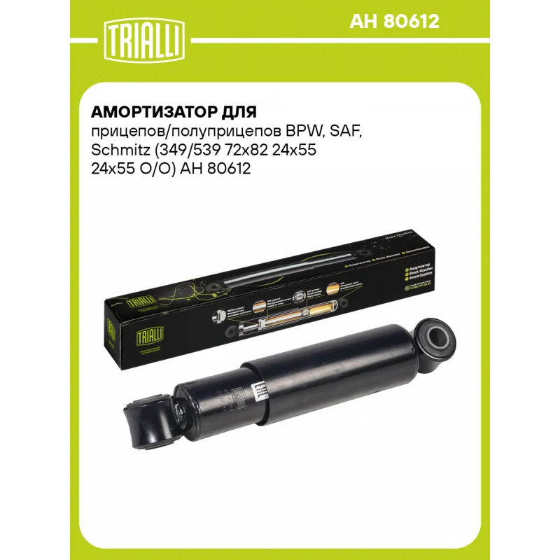 Амортизатор для прицепов/полуприцепов BPW, SAF, Schmitz (349/539 72х82 24х55 24х55 О/О) Описание: Амортизатор AH 80612 бренда TRIALLI – это устройство для гашения колебаний (демпфирования) и поглощения толчков и ударов, действующих на раму. Особенности AH 80612: - Вид – Масляный; - Тип – Двухтрубный, гидравлический; Для крепления к деталям кузова или подвески используются крепления: верхнее Проушина/сайлентблок ; и нижнее Проушина/сайлентблок. Совместим с: Подбор по VIN-номеру вашего автомобиля - через кнопку 'Задать вопрос'. Специалист проверит применяемость и ответит вам. Преимущества: - Инновационная технология производства; - Контроль качества каждой позиции по чертежам и с помощью 3D модели; - Сальник NOK; - Высокоэффективная система проектирования; - Гарантия до двух лет или 60 000 км пробега; Амортизаторы автомобильные существенно влияют на комфорт вождения, сокращая вибрации от неровностей дороги, что делает поездку более плавной и приятной. Регулярное и своевременное обслуживание амортизаторов помогут продлить их срок службы и обеспечить надёжную работу. Характеристики: Артикул: AH 80612 OEM номера: 02.3722.8800, 02.3722.9200, 02.3722.8802, 13290, 02.3702.9200 Товарная линейка: BLACK Количество на автомобиль: 2 Вид амортизатора: Масляный Тип верхнего крепления: Проушина/сайлентблок Тип нижнего крепления: Проушина/сайлентблок Диаметр корпуса, мм: 65 Диаметр штока, мм: 20 Ход штока, мм: 190 Тип амортизатора: Двухтрубный, гидравлический Ось (сторона установки): Сзади, слева/справа Дополнительная информация: Упаковка изделия может отличаться от представленной на фото Присоединительная длина 2, мм: 541±3 Присоединительная длина 1, мм: 351±3 Гарантийный срок: 2 года/60 000 км Комплектация: Амортизатор задний - 1 шт Шарнир резинометаллический - 2 шт Гарантия: от 1 года.