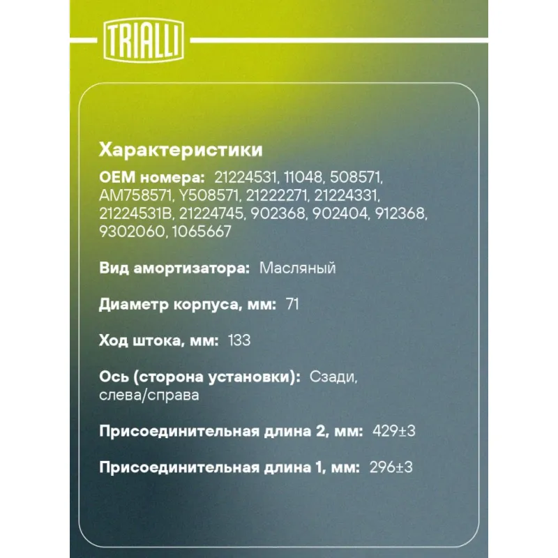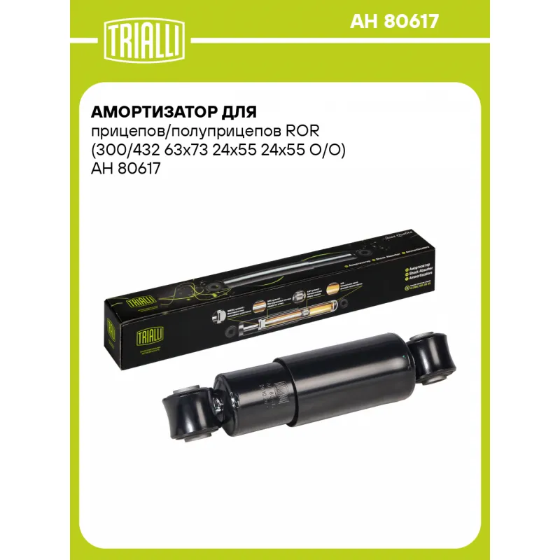 Амортизатор для прицепов/полуприцепов ROR (300/432 63х73 24х55 24х55 О/О) Описание: Амортизатор AH 80617 бренда TRIALLI – это устройство для гашения колебаний (демпфирования) и поглощения толчков и ударов, действующих на раму. Особенности AH 80617: - Вид – Масляный; - Тип – Двухтрубный, гидравлический; Для крепления к деталям кузова или подвески используются крепления: верхнее Проушина/сайлентблок ; и нижнее Проушина/сайлентблок. Совместим с: Подбор по VIN-номеру вашего автомобиля - через кнопку 'Задать вопрос'. Специалист проверит применяемость и ответит вам. Преимущества: - Инновационная технология производства; - Контроль качества каждой позиции по чертежам и с помощью 3D модели; - Сальник NOK; - Высокоэффективная система проектирования; - Гарантия до двух лет или 60 000 км пробега; Амортизаторы автомобильные существенно влияют на комфорт вождения, сокращая вибрации от неровностей дороги, что делает поездку более плавной и приятной. Регулярное и своевременное обслуживание амортизаторов помогут продлить их срок службы и обеспечить надёжную работу. Характеристики: Артикул: AH 80617 OEM номера: 21224531, 11048, 508571, AM758571, Y508571, 21222271, 21224331, 21224531B, 21224745, 902368, 902404, 912368, 9302060, 1065667 Товарная линейка: BLACK Количество на автомобиль: 2 Вид амортизатора: Масляный Тип верхнего крепления: Проушина/сайлентблок Тип нижнего крепления: Проушина/сайлентблок Диаметр корпуса, мм: 71 Диаметр штока, мм: 20 Ход штока, мм: 133 Тип амортизатора: Двухтрубный, гидравлический Ось (сторона установки): Сзади, слева/справа Дополнительная информация: Упаковка изделия может отличаться от представленной на фото Присоединительная длина 2, мм: 429±3 Присоединительная длина 1, мм: 296±3 Гарантийный срок: 2 года/60 000 км Комплектация: Амортизатор задний - 1 шт Шарнир резинометаллический - 2 шт Гарантия: от 1 года.