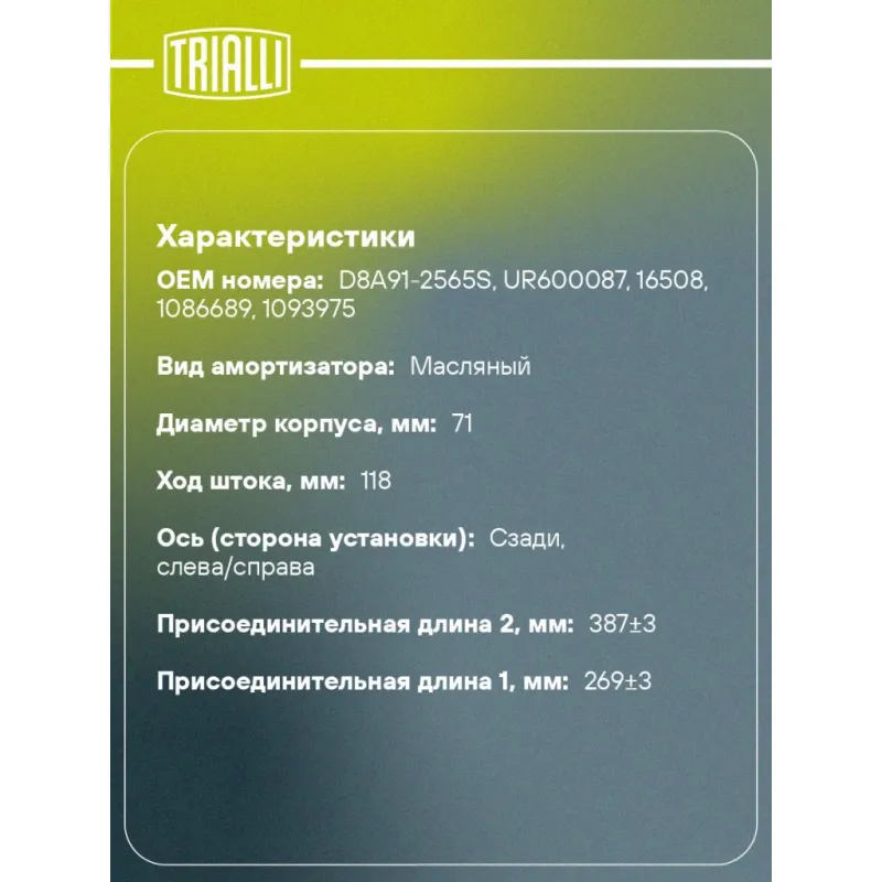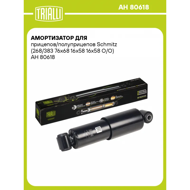 Амортизатор для прицепов/полуприцепов Schmitz (268/383 76х68 16х58 16х58 О/О) Описание: Амортизатор AH 80618 бренда TRIALLI – это устройство для гашения колебаний (демпфирования) и поглощения толчков и ударов, действующих на раму. Особенности AH 80618: - Вид – Масляный; - Тип – Двухтрубный, гидравлический; Для крепления к деталям кузова или подвески используются крепления: верхнее Проушина/сайлентблок ; и нижнее Проушина/сайлентблок. Совместим с: Подбор по VIN-номеру вашего автомобиля - через кнопку 'Задать вопрос'. Специалист проверит применяемость и ответит вам. Преимущества: - Инновационная технология производства; - Контроль качества каждой позиции по чертежам и с помощью 3D модели; - Сальник NOK; - Высокоэффективная система проектирования; - Гарантия до двух лет или 60 000 км пробега; Амортизаторы автомобильные существенно влияют на комфорт вождения, сокращая вибрации от неровностей дороги, что делает поездку более плавной и приятной. Регулярное и своевременное обслуживание амортизаторов помогут продлить их срок службы и обеспечить надёжную работу. Характеристики: Артикул: AH 80618 OEM номера: D8A91-2565S, UR600087, 16508, 1086689, 1093975 Товарная линейка: BLACK Количество на автомобиль: 2 Вид амортизатора: Масляный Тип верхнего крепления: Проушина/сайлентблок Тип нижнего крепления: Проушина/сайлентблок Диаметр корпуса, мм: 71 Диаметр штока, мм: 20 Ход штока, мм: 118 Тип амортизатора: Двухтрубный, гидравлический Ось (сторона установки): Сзади, слева/справа Дополнительная информация: Упаковка изделия может отличаться от представленной на фото Присоединительная длина 2, мм: 387±3 Присоединительная длина 1, мм: 269±3 Гарантийный срок: 2 года/60 000 км Комплектация: Амортизатор задний - 1 шт Шарнир резинометаллический - 2 шт Гарантия: от 1 года.