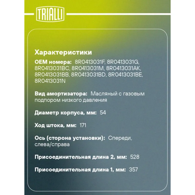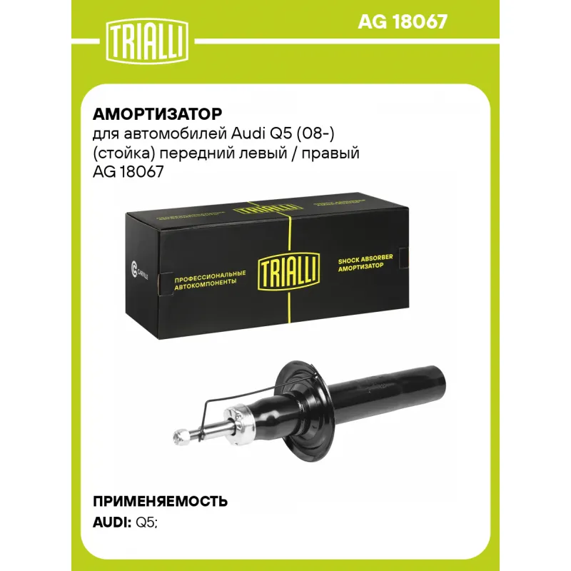 Амортизатор для автомобилей Audi Q5 (08-) (стойка) передний левый / правый Описание: Амортизатор AG 18067 бренда TRIALLI – это устройство для гашения колебаний (демпфирования) и поглощения толчков и ударов, действующих на раму. Особенности AG 18067: - Вид – Масляный с газовым подпором низкого давления; - Тип – Двухтрубный, гидравлический; Для крепления к деталям кузова или подвески используются крепления: верхнее Шток M12x1.5; и нижнее Кронштейн. Амортизатор в машину (стойка) имеет специальную площадку для установки пружины подвески. Совместим с: AUDI Q5.Подбор по VIN-номеру вашего автомобиля - через кнопку 'Задать вопрос'. Специалист проверит применяемость и ответит вам. Преимущества: - Инновационная технология производства; - Контроль качества каждой позиции по чертежам и с помощью 3D модели; - Сальник NOK; - Высокоэффективная система проектирования; - Гарантия до двух лет или 60 000 км пробега; Амортизаторы автомобильные существенно влияют на комфорт вождения, сокращая вибрации от неровностей дороги, что делает поездку более плавной и приятной. Регулярное и своевременное обслуживание амортизаторов помогут продлить их срок службы и обеспечить надёжную работу. Характеристики: Артикул: AG 18067 OEM номера: 8R0413031F, 8R0413031G, 8R0413031BC, 8R0413031M, 8R0413031AK, 8R0413031BB, 8R0413031BD, 8R0413031BE, 8R0413031N Товарная линейка: BLACK Количество на автомобиль: 2 Вид амортизатора: Масляный с газовым подпором низкого давления Тип верхнего крепления: Шток Тип нижнего крепления: Кронштейн Диаметр корпуса, мм: 54 Диаметр штока, мм: 18 Ход штока, мм: 171 Размер резьбы штока: M12x1.5 Тип амортизатора: Двухтрубный, гидравлический Ось (сторона установки): Спереди, слева/справа Дополнительная информация: Упаковка изделия может отличаться от представленной на фото Присоединительная длина 2, мм: 528 Присоединительная длина 1, мм: 357 Сопутствующий товар: Амортизаторы: AG 18524 Гарантийный срок: 2 года/60 000 км Комплектация: Гайка крепежная - 1 шт Амортизатор передний - 1 шт Гарантия: от 1 года.