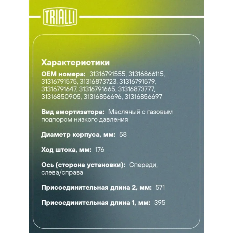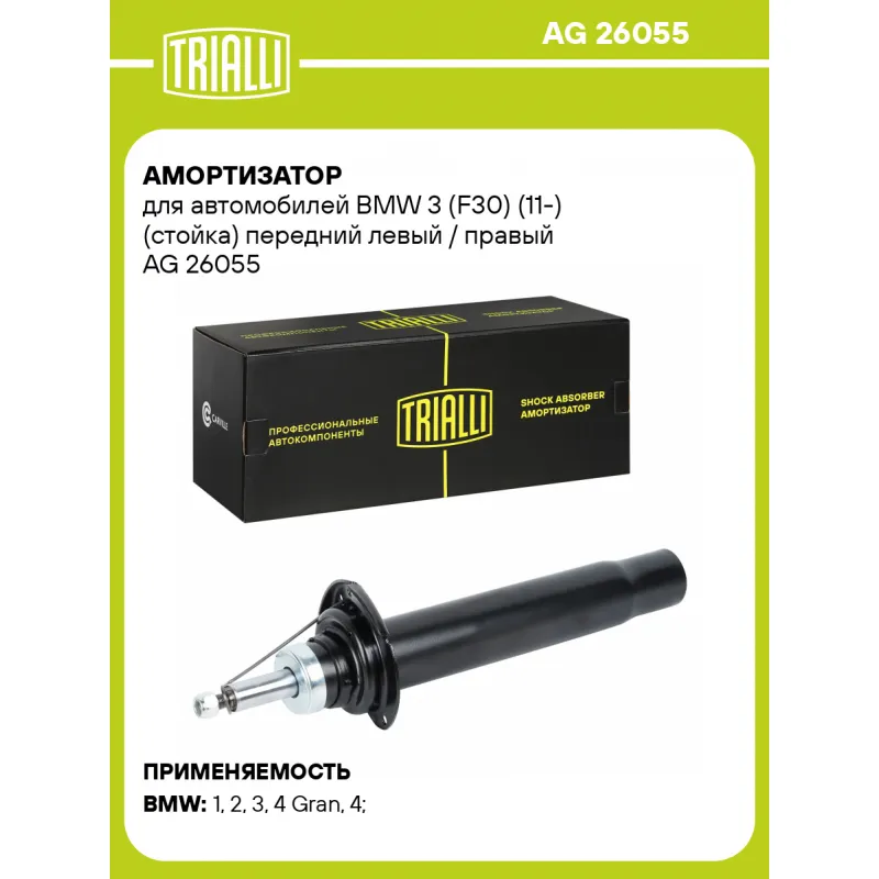Амортизатор для автомобилей BMW 3 (F30) (11-) (стойка) передний левый / правый Описание: Амортизатор AG 26055 бренда TRIALLI – это устройство для гашения колебаний (демпфирования) и поглощения толчков и ударов, действующих на раму. Особенности AG 26055: - Вид – Масляный с газовым подпором низкого давления; - Тип – Двухтрубный, гидравлический; Для крепления к деталям кузова или подвески используются крепления: верхнее Шток M12x1,5; и нижнее Зажим. Амортизатор в машину (стойка) имеет специальную площадку для установки пружины подвески. Совместим с: BMW 1, 2, 3, 4.Подбор по VIN-номеру вашего автомобиля - через кнопку 'Задать вопрос'. Специалист проверит применяемость и ответит вам. Преимущества: - Инновационная технология производства; - Контроль качества каждой позиции по чертежам и с помощью 3D модели; - Сальник NOK; - Высокоэффективная система проектирования; - Гарантия до двух лет или 60 000 км пробега; Амортизаторы автомобильные существенно влияют на комфорт вождения, сокращая вибрации от неровностей дороги, что делает поездку более плавной и приятной. Регулярное и своевременное обслуживание амортизаторов помогут продлить их срок службы и обеспечить надёжную работу. Характеристики: Артикул: AG 26055 OEM номера: 31316791555, 31316866115, 31316791575, 31316873723, 31316791579, 31316791647, 31316791665, 31316873777, 31316850905, 31316856696, 31316856697, 31316873797, 31316873774, 31316873776, 31316874371, 31316866112, 31316874382, 31316850904, 31316859040, 31316873773, 31316874378, 31316876753, 31316791581, 31316866114, 31316874381, 31316791663, 31316873763, 31316868661, 31316873765, 31316854689, 31316873787, 31316874367, 31316850902, 31316856626, 31316873750, 31306850903, 31316873752, 31316868657, 31316854691, 31316868655, 31316868659, 31316873762, 31316868520, 31316873738, 31316791541, 31316850357, 31316862171, 31316865128, 31316873721, 31316850358, 31316874368, 31316791651, 31316866113, 31316874379, 31316799583, 31316799584 Сопутствующий товар: Амортизаторы: AG 26509 Товарная линейка: BLACK Количество на автомобиль: 2 Вид амортизатора: Масляный с газовым подпором низкого давления Тип верхнего крепления: Шток Тип нижнего крепления: Зажим Диаметр корпуса, мм: 58 Диаметр штока, мм: 22 Ход штока, мм: 176 Размер резьбы штока: M12x1,5 Тип амортизатора: Двухтрубный, гидравлический Ось (сторона установки): Спереди, слева/справа Дополнительная информация: Упаковка изделия может отличаться от представленной на фото Присоединительная длина 2, мм: 571 Присоединительная длина 1, мм: 395 Гарантийный срок: 2 года/60 000 км Комплектация: Амортизатор (стойка) передний - 1 шт Гайка крепежная - 1 шт Гарантия: от 1 года.