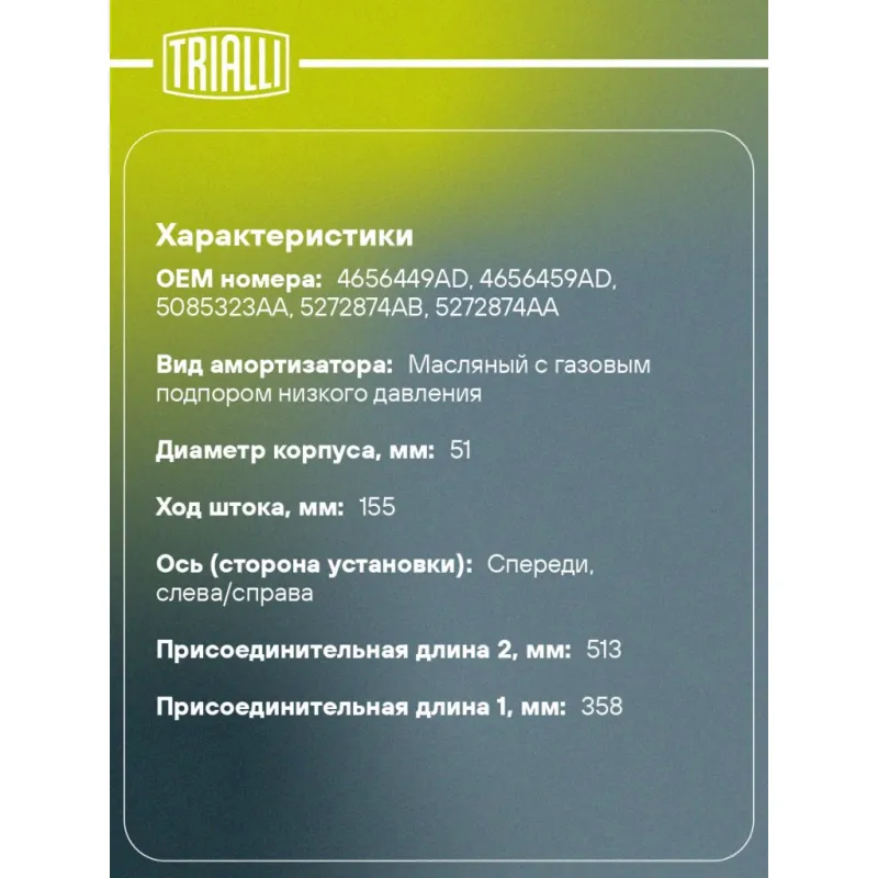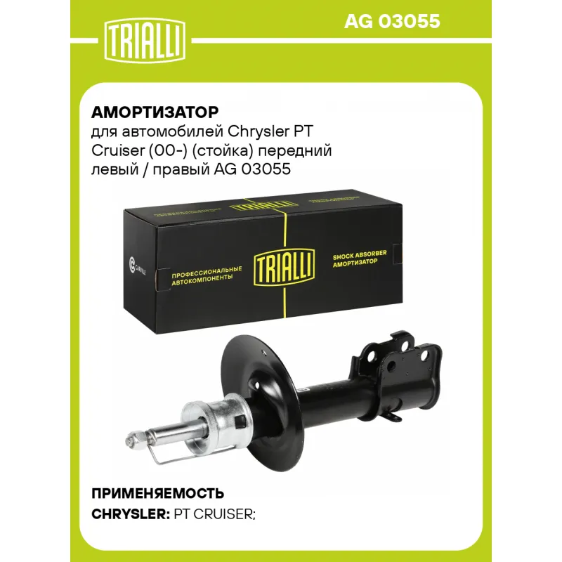 Амортизатор для автомобилей Chrysler PT Cruiser (00-) (стойка) передний левый / правый Описание: Амортизатор AG 03055 бренда TRIALLI – это устройство для гашения колебаний (демпфирования) и поглощения толчков и ударов, действующих на раму. Особенности AG 03055: - Вид – Масляный с газовым подпором низкого давления; - Тип – Двухтрубный, гидравлический; Для крепления к деталям кузова или подвески используются крепления: верхнее Шток M14x2; и нижнее Скоба. Амортизатор в машину (стойка) имеет специальную площадку для установки пружины подвески. Совместим с: CHRYSLER PT CRUISER.Подбор по VIN-номеру вашего автомобиля - через кнопку 'Задать вопрос'. Специалист проверит применяемость и ответит вам. Преимущества: - Инновационная технология производства; - Контроль качества каждой позиции по чертежам и с помощью 3D модели; - Сальник NOK; - Высокоэффективная система проектирования; - Гарантия до двух лет или 60 000 км пробега; Амортизаторы автомобильные существенно влияют на комфорт вождения, сокращая вибрации от неровностей дороги, что делает поездку более плавной и приятной. Регулярное и своевременное обслуживание амортизаторов помогут продлить их срок службы и обеспечить надёжную работу. Характеристики: Артикул: AG 03055 OEM номера: 4656449AD, 4656459AD, 5085323AA, 5272874AB, 5272874AA Товарная линейка: BLACK Количество на автомобиль: 2 Вид амортизатора: Масляный с газовым подпором низкого давления Тип верхнего крепления: Шток Тип нижнего крепления: Скоба Диаметр корпуса, мм: 51 Диаметр штока, мм: 22 Ход штока, мм: 155 Размер резьбы штока: M14x2 Тип амортизатора: Двухтрубный, гидравлический Ось (сторона установки): Спереди, слева/справа Присоединительная длина 2, мм: 513 Присоединительная длина 1, мм: 358 Сопутствующий товар: Ремонтные комплекты амортизаторов: BC 1948, BCS 2048 Сопутствующий товар: Амортизаторы: AG 03518 Гарантийный срок: 2 года/60 000 км Комплектация: Амортизатор (стойка) передний - 1 шт Гайка крепежная - 1 шт Гарантия: от 1 года.