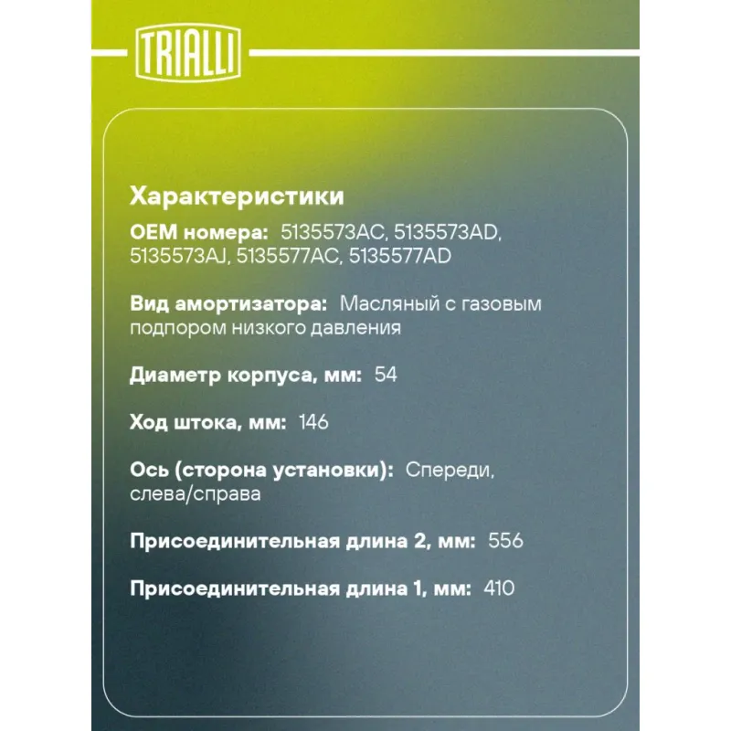 Амортизатор для автомобилей Jeep Grand Cherokee (05-) (стойка) передний левый / правый Описание: Амортизатор AG 03059 бренда TRIALLI – это устройство для гашения колебаний (демпфирования) и поглощения толчков и ударов, действующих на раму. Особенности AG 03059: - Вид – Масляный с газовым подпором низкого давления; - Тип – Двухтрубный, гидравлический; Для крепления к деталям кузова или подвески используются крепления: верхнее Шток M12x1.25; и нижнее Кронштейн. Амортизатор в машину (стойка) имеет специальную площадку для установки пружины подвески. Совместим с: JEEP COMMANDER, GRAND CHEROKEE.Подбор по VIN-номеру вашего автомобиля - через кнопку 'Задать вопрос'. Специалист проверит применяемость и ответит вам. Преимущества: - Инновационная технология производства; - Контроль качества каждой позиции по чертежам и с помощью 3D модели; - Сальник NOK; - Высокоэффективная система проектирования; - Гарантия до двух лет или 60 000 км пробега; Амортизаторы автомобильные существенно влияют на комфорт вождения, сокращая вибрации от неровностей дороги, что делает поездку более плавной и приятной. Регулярное и своевременное обслуживание амортизаторов помогут продлить их срок службы и обеспечить надёжную работу. Характеристики: Артикул: AG 03059 OEM номера: 5135573AC, 5135573AD, 5135573AJ, 5135577AC, 5135577AD Товарная линейка: BLACK Количество на автомобиль: 2 Вид амортизатора: Масляный с газовым подпором низкого давления Тип верхнего крепления: Шток Тип нижнего крепления: Кронштейн Диаметр корпуса, мм: 54 Диаметр штока, мм: 16 Ход штока, мм: 146 Размер резьбы штока: M12x1.25 Тип амортизатора: Двухтрубный, гидравлический Ось (сторона установки): Спереди, слева/справа Присоединительная длина 2, мм: 556 Присоединительная длина 1, мм: 410 Сопутствующий товар: Амортизаторы: AG 03521 Гарантийный срок: 2 года/60 000 км Комплектация: Амортизатор (стойка) передний - 1 шт Гайка крепежная - 1 шт Гарантия: от 1 года.