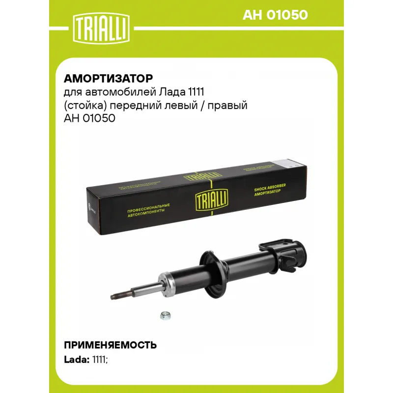 Амортизатор для автомобилей Лада 1111 (стойка) передний левый / правый Описание: Амортизатор AH 01050 бренда TRIALLI – это устройство для гашения колебаний (демпфирования) и поглощения толчков и ударов, действующих на раму. Особенности AH 01050: - Вид – Масляный; - Тип – Двухтрубный, гидравлический; Для крепления к деталям кузова или подвески используются крепления: верхнее Шток M12x1.25; и нижнее Скоба. Амортизатор в машину (стойка) имеет специальную площадку для установки пружины подвески. Совместим с: LADA OKA.Подбор по VIN-номеру вашего автомобиля - через кнопку 'Задать вопрос'. Специалист проверит применяемость и ответит вам. Преимущества: - Инновационная технология производства; - Контроль качества каждой позиции по чертежам и с помощью 3D модели; - Сальник NOK; - Высокоэффективная система проектирования; - Гарантия до двух лет или 60 000 км пробега; Амортизаторы автомобильные существенно влияют на комфорт вождения, сокращая вибрации от неровностей дороги, что делает поездку более плавной и приятной. Регулярное и своевременное обслуживание амортизаторов помогут продлить их срок службы и обеспечить надёжную работу. Характеристики: Артикул: AH 01050 OEM номера: 1111-2905002, 11110-2905002-00 Товарная линейка: BLACK Количество на автомобиль: 2 Вид амортизатора: Масляный Тип верхнего крепления: Шток Тип нижнего крепления: Скоба Диаметр корпуса, мм: 48,5 Диаметр штока, мм: 20 Ход штока, мм: 140 Размер резьбы штока: M12x1.25 Тип амортизатора: Двухтрубный, гидравлический Ось (сторона установки): Спереди, слева/справа Дополнительная информация: Упаковка изделия может отличаться от представленной на фото Присоединительная длина 2, мм: 498 Присоединительная длина 1, мм: 358 Сопутствующий товар: Ремонтные комплекты амортизаторов: BC 1848, BCS 1848 Сопутствующий товар: Амортизаторы: AG 01001,AH 01511 Гарантийный срок: 2 года/60 000 км Подходит для авто: ВАЗ 1111 (Ока) Для проверки применяемости отправьте VIN автомобиля через вкладку "Есть вопросы о товаре?" Комплектация: Амортизатор (стойка) передний - 1 шт Гайка крепежная - 1 шт Гарантия: от 1 года.