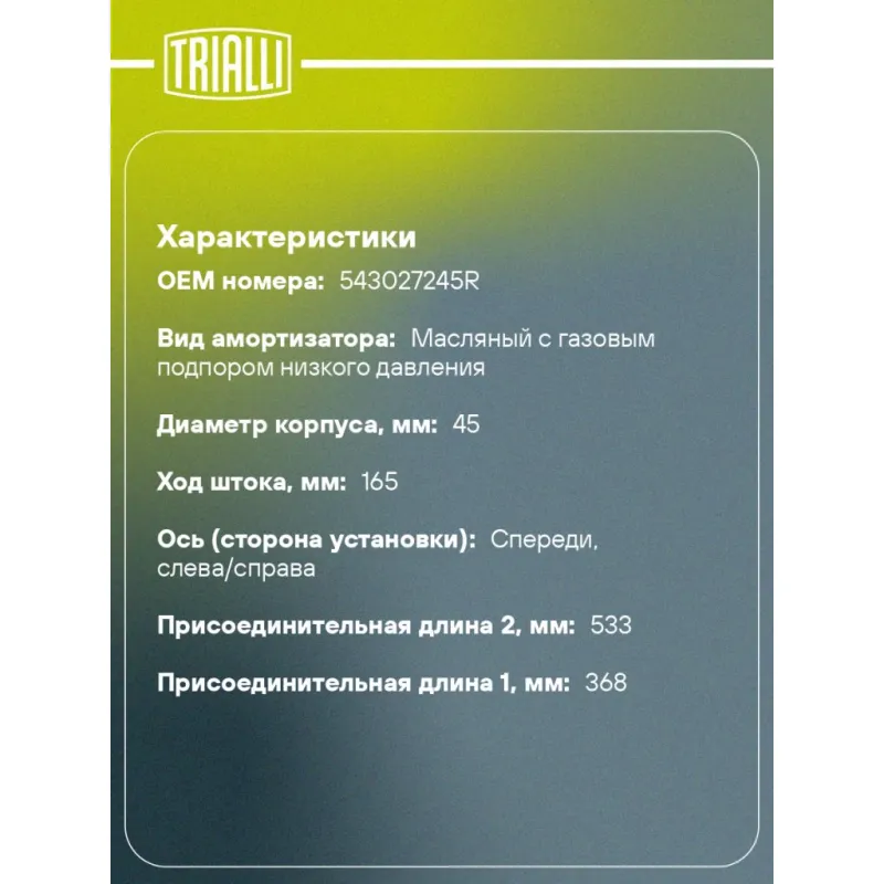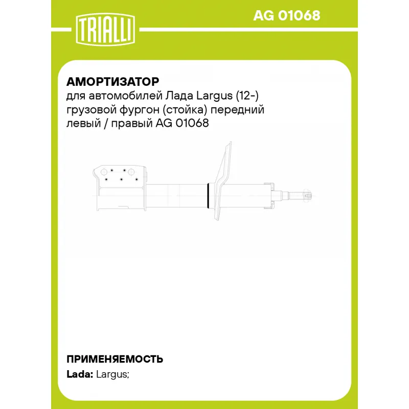 Амортизатор для автомобилей Лада Largus (12-) грузовой фургон (стойка) передний левый / правый Описание: Амортизатор AG 01068 бренда TRIALLI – это устройство для гашения колебаний (демпфирования) и поглощения толчков и ударов, действующих на раму. Особенности AG 01068: - Вид – Масляный с газовым подпором низкого давления; - Тип – Двухтрубный, гидравлический; Для крепления к деталям кузова или подвески используются крепления: верхнее Шток M14x1.5; и нижнее Скоба. Амортизатор в машину (стойка) имеет специальную площадку для установки пружины подвески. Совместим с: LADA LARGUS.Подбор по VIN-номеру вашего автомобиля - через кнопку 'Задать вопрос'. Специалист проверит применяемость и ответит вам. Преимущества: - Инновационная технология производства; - Контроль качества каждой позиции по чертежам и с помощью 3D модели; - Сальник NOK; - Высокоэффективная система проектирования; - Гарантия до двух лет или 60 000 км пробега; Амортизаторы автомобильные существенно влияют на комфорт вождения, сокращая вибрации от неровностей дороги, что делает поездку более плавной и приятной. Регулярное и своевременное обслуживание амортизаторов помогут продлить их срок службы и обеспечить надёжную работу. Характеристики: Артикул: AG 01068 OEM номера: 543027245R Товарная линейка: BLACK Количество на автомобиль: 2 Вид амортизатора: Масляный с газовым подпором низкого давления Тип верхнего крепления: Шток Тип нижнего крепления: Скоба Диаметр корпуса, мм: 45 Диаметр штока, мм: 20 Ход штока, мм: 165 Размер резьбы штока: M14x1.5 Тип амортизатора: Двухтрубный, гидравлический Ось (сторона установки): Спереди, слева/справа Дополнительная информация: Упаковка изделия может отличаться от представленной на фото Присоединительная длина 2, мм: 533 Сопутствующий товар: Опоры передних стоек: SA 0157 Присоединительная длина 1, мм: 368 Сопутствующий товар: Ремонтные комплекты амортизаторов: BCS 0105, BC 1848, BC 1866, BCS 1848, BCS 1866,BC 0156, BCS 0156, BC 0186 Сопутствующий товар: Амортизаторы: AG 01067; AG 01512; AG 01521 Гарантийный срок: 2 года/60 000 км Подходит для авто: ВАЗ Largus (12-) Для проверки применяемости отправьте VIN автомобиля через вкладку "Есть вопросы о товаре?" Комплектация: Амортизатор (стойка) передний - 1 шт Гайка крепежная - 1 шт Гарантия: от 1 года.