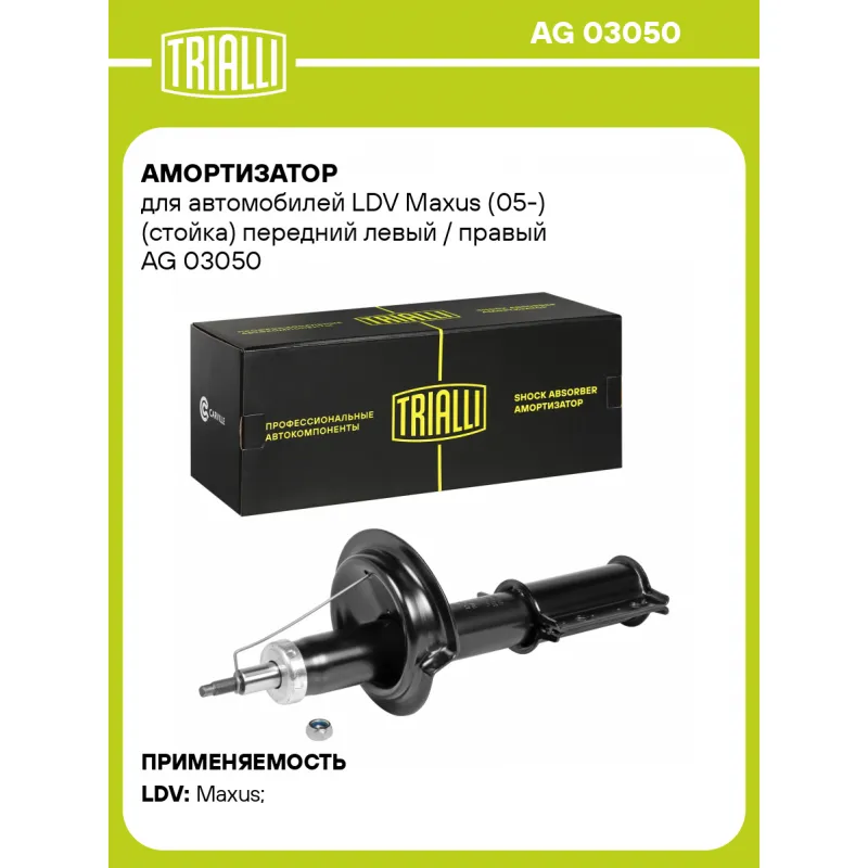 Амортизатор для автомобилей LDV Maxus (05-) (стойка) передний левый / правый Описание: Амортизатор AG 03050 бренда TRIALLI – это устройство для гашения колебаний (демпфирования) и поглощения толчков и ударов, действующих на раму. Особенности AG 03050: - Вид – Масляный с газовым подпором низкого давления; - Тип – Двухтрубный, гидравлический; Для крепления к деталям кузова или подвески используются крепления: верхнее Шток M14x1,5; и нижнее Спец. кронштейн. Амортизатор в машину (стойка) имеет специальную площадку для установки пружины подвески. Совместим с: LDV MAXUS.Подбор по VIN-номеру вашего автомобиля - через кнопку 'Задать вопрос'. Специалист проверит применяемость и ответит вам. Преимущества: - Инновационная технология производства; - Контроль качества каждой позиции по чертежам и с помощью 3D модели; - Сальник NOK; - Высокоэффективная система проектирования; - Гарантия до двух лет или 60 000 км пробега; Амортизаторы автомобильные существенно влияют на комфорт вождения, сокращая вибрации от неровностей дороги, что делает поездку более плавной и приятной. Регулярное и своевременное обслуживание амортизаторов помогут продлить их срок службы и обеспечить надёжную работу. Характеристики: Артикул: AG 03050 OEM номера: 542990005, 542990003 Товарная линейка: BLACK Количество на автомобиль: 2 Вид амортизатора: Масляный с газовым подпором низкого давления Тип верхнего крепления: Шток Тип нижнего крепления: Спец. кронштейн Диаметр корпуса, мм: 58 Диаметр штока, мм: 25 Ход штока, мм: 245 Размер резьбы штока: M14x1,5 Тип амортизатора: Двухтрубный, гидравлический Ось (сторона установки): Спереди, слева/справа Присоединительная длина 2, мм: 664 Присоединительная длина 1, мм: 419 Сопутствующий товар: Амортизаторы: AG 03514 Гарантийный срок: 2 года/60 000 км Подходит для авто: LDV Maxus (05-) Для проверки применяемости отправьте VIN автомобиля через вкладку "Есть вопросы о товаре?" Комплектация: Амортизатор (стойка) передний - 1 шт Гайка крепежная - 1 шт Гарантия: от 1 года.