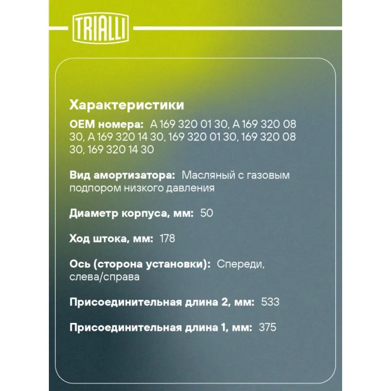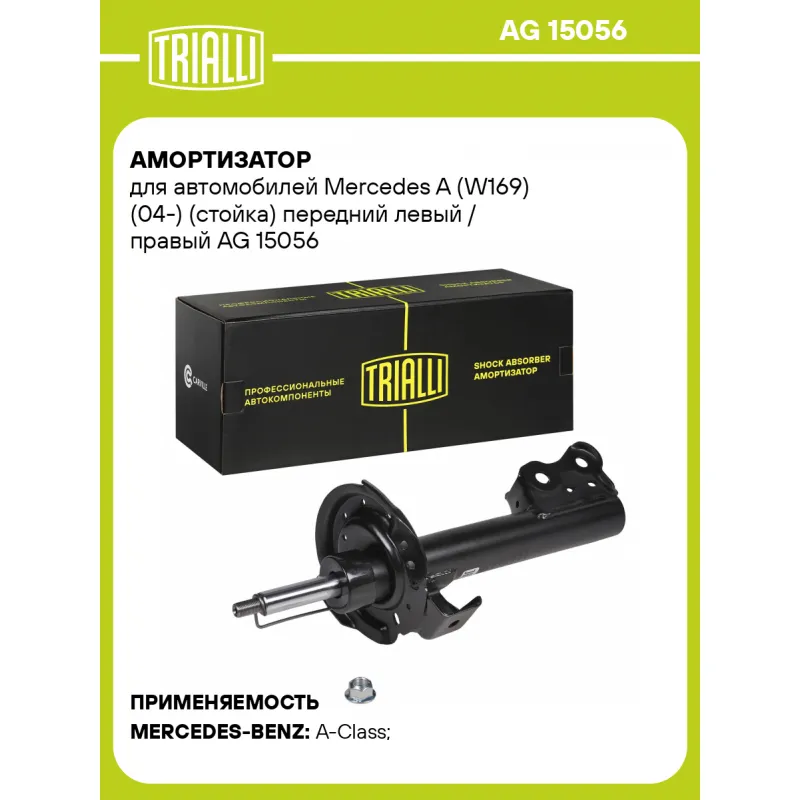 Амортизатор для автомобилей Mercedes A (W169) (04-) (стойка) передний левый / правый Описание: Амортизатор AG 15056 бренда TRIALLI – это устройство для гашения колебаний (демпфирования) и поглощения толчков и ударов, действующих на раму. Особенности AG 15056: - Вид – Масляный с газовым подпором низкого давления; - Тип – Двухтрубный, гидравлический; Для крепления к деталям кузова или подвески используются крепления: верхнее Шток M14x1.5; и нижнее Скоба. Амортизатор в машину (стойка) имеет специальную площадку для установки пружины подвески. Совместим с: MERCEDES-BENZ A-Class.Подбор по VIN-номеру вашего автомобиля - через кнопку 'Задать вопрос'. Специалист проверит применяемость и ответит вам. Преимущества: - Инновационная технология производства; - Контроль качества каждой позиции по чертежам и с помощью 3D модели; - Сальник NOK; - Высокоэффективная система проектирования; - Гарантия до двух лет или 60 000 км пробега; Амортизаторы автомобильные существенно влияют на комфорт вождения, сокращая вибрации от неровностей дороги, что делает поездку более плавной и приятной. Регулярное и своевременное обслуживание амортизаторов помогут продлить их срок службы и обеспечить надёжную работу. Характеристики: Артикул: AG 15056 OEM номера: A 169 320 01 30, A 169 320 08 30, A 169 320 14 30, 169 320 01 30, 169 320 08 30, 169 320 14 30 Товарная линейка: BLACK Количество на автомобиль: 2 Вид амортизатора: Масляный с газовым подпором низкого давления Тип верхнего крепления: Шток Тип нижнего крепления: Скоба Диаметр корпуса, мм: 50 Диаметр штока, мм: 22 Ход штока, мм: 178 Размер резьбы штока: M14x1.5 Тип амортизатора: Двухтрубный, гидравлический Ось (сторона установки): Спереди, слева/справа Присоединительная длина 2, мм: 533 Присоединительная длина 1, мм: 375 Сопутствующий товар: Ремонтные комплекты амортизаторов: BC 1966, BCS 2066 Сопутствующий товар: Амортизаторы: AG 15506 Гарантийный срок: 2 года/60 000 км Комплектация: Амортизатор (стойка) передний - 1 шт Гайка крепежная - 1 шт Гарантия: от 1 года.