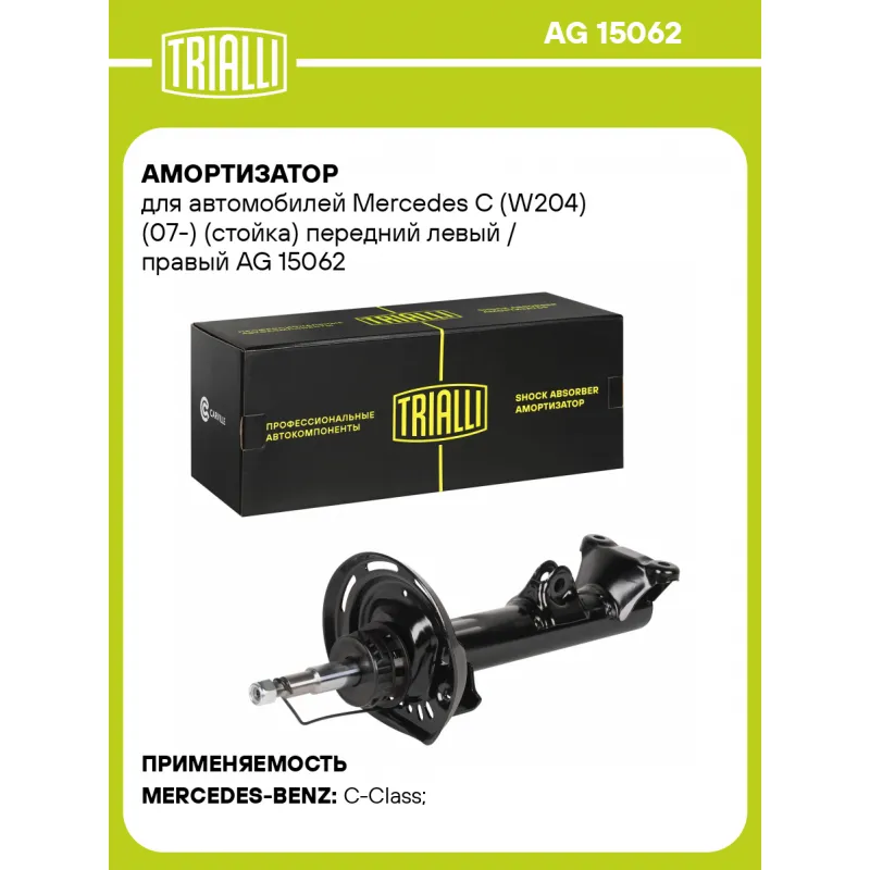 Амортизатор для автомобилей Mercedes C (W204) (07-) (стойка) передний левый / правый Описание: Амортизатор AG 15062 бренда TRIALLI – это устройство для гашения колебаний (демпфирования) и поглощения толчков и ударов, действующих на раму. Особенности AG 15062: - Вид – Масляный с газовым подпором низкого давления; - Тип – Двухтрубный, гидравлический; Для крепления к деталям кузова или подвески используются крепления: верхнее Шток M14x1,5; и нижнее Кронштейн. Амортизатор в машину (стойка) имеет специальную площадку для установки пружины подвески. Совместим с: MERCEDES-BENZ C-Class.Подбор по VIN-номеру вашего автомобиля - через кнопку 'Задать вопрос'. Специалист проверит применяемость и ответит вам. Преимущества: - Инновационная технология производства; - Контроль качества каждой позиции по чертежам и с помощью 3D модели; - Сальник NOK; - Высокоэффективная система проектирования; - Гарантия до двух лет или 60 000 км пробега; Амортизаторы автомобильные существенно влияют на комфорт вождения, сокращая вибрации от неровностей дороги, что делает поездку более плавной и приятной. Регулярное и своевременное обслуживание амортизаторов помогут продлить их срок службы и обеспечить надёжную работу. Характеристики: Артикул: AG 15062 OEM номера: A 204 320 01 30, A 204 320 04 13, A 204 320 06 66, A 204 320 07 30, A 204 320 07 66, A 204 320 08 66, 2043207466, 2043207566, 2043232400, 2043232600, 2043233400, 2043233500, 2043204830, 2043206966, 2043207066, 2043207166, 2043207266, 2043207366, 2043202268, 2043202368, 2043202468, 2043202568, 2043202668, 2043203330, 2043200966, 2043201066, 2043201166, 2043201266, 2043202068, 2043202168, 2043200130, 2043200413, 2043200666, 2043200730, 2043200766, 2043200866, A 204 320 74 66, A 204 320 75 66, A 204 323 24 00, A 204 323 26 00, A 204 323 34 00, A 204 323 35 00, A 204 320 48 30, A 204 320 69 66, A 204 320 70 66, A 204 320 71 66, A 204 320 72 66, A 204 320 73 66, A 204 320 22 68, A 204 320 23 68, A 204 320 24 68, A 204 320 25 68, A 204 320 26 68, A 204 320 33 30, A 204 320 09 66, A 204 320 10 66, A 204 320 11 66, A 204 320 12 66, A 204 320 20 68, A 204 320 21 68 Товарная линейка: BLACK Количество на автомобиль: 2 Вид амортизатора: Масляный с газовым подпором низкого давления Тип верхнего крепления: Шток Тип нижнего крепления: Кронштейн Диаметр корпуса, мм: 56 Диаметр штока, мм: 25 Ход штока, мм: 116 Размер резьбы штока: M14x1,5 Тип амортизатора: Двухтрубный, гидравлический Ось (сторона установки): Спереди, слева/справа Дополнительная информация: Упаковка изделия может отличаться от представленной на фото Присоединительная длина 2, мм: 496 Присоединительная длина 1, мм: 380 Сопутствующий товар: Амортизаторы: AG 15508 Гарантийный срок: 2 года/60 000 км Комплектация: Гайка крепежная - 1 шт Амортизатор (стойка) передний - 1 шт Гарантия: от 1 года.
