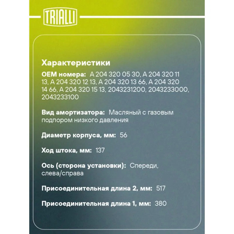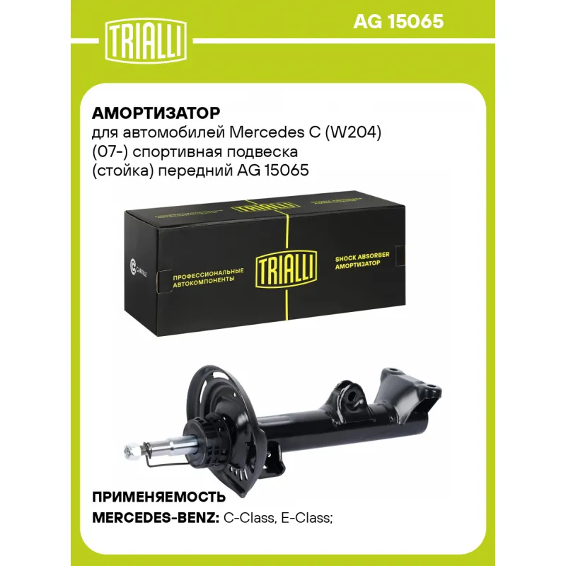 Амортизатор для автомобилей Mercedes C (W204) (07-) спортивная подвеска (стойка) передний Описание: Амортизатор AG 15065 бренда TRIALLI – это устройство для гашения колебаний (демпфирования) и поглощения толчков и ударов, действующих на раму. Особенности AG 15065: - Вид – Масляный с газовым подпором низкого давления; - Тип – Двухтрубный, гидравлический; Для крепления к деталям кузова или подвески используются крепления: верхнее Шток M14x1,5; и нижнее Кронштейн. Амортизатор в машину (стойка) имеет специальную площадку для установки пружины подвески. Совместим с: MERCEDES-BENZ C-Class, E-Class.Подбор по VIN-номеру вашего автомобиля - через кнопку 'Задать вопрос'. Специалист проверит применяемость и ответит вам. Преимущества: - Инновационная технология производства; - Контроль качества каждой позиции по чертежам и с помощью 3D модели; - Сальник NOK; - Высокоэффективная система проектирования; - Гарантия до двух лет или 60 000 км пробега; Амортизаторы автомобильные существенно влияют на комфорт вождения, сокращая вибрации от неровностей дороги, что делает поездку более плавной и приятной. Регулярное и своевременное обслуживание амортизаторов помогут продлить их срок службы и обеспечить надёжную работу. Характеристики: Артикул: AG 15065 OEM номера: A 204 320 05 30, A 204 320 11 13, A 204 320 12 13, A 204 320 13 66, A 204 320 14 66, A 204 320 15 13, 2043231200, 2043233000, 2043233100, 2043233330, 2043205638, 2043205738, 2043206138, 2043206238, 2043206338, 2043206438, 2043203066, 2043205138, 2043205238, 2043205338, 2043205438, 2043205538, 2043202466, 2043202566, 2043202666, 2043202766, 2043202866, 2043202966, 2043201913, 2043201966, 2043202066, 2043202166, 2043202266, 2043202366, 2043201613, 2043201666, 2043201713, 2043201766, 2043201813, 2043201866, 2043201113, 2043201213, 2043201366, 2043201466, 2043201513, 2043201566, A 204 320 64 38, A 204 323 12 00, A 204 323 30 00, A 204 323 31 00, A 204 323 33 30, 2043200530, A 204 320 55 38, A 204 320 56 38, A 204 320 57 38, A 204 320 61 38, A 204 320 62 38, A 204 320 63 38, A 204 320 29 66, A 204 320 30 66, A 204 320 51 38, A 204 320 52 38, A 204 320 53 38, A 204 320 54 38, A 204 320 23 66, A 204 320 24 66, A 204 320 25 66, A 204 320 26 66, A 204 320 27 66, A 204 320 28 66, A 204 320 18 66, A 204 320 19 13, A 204 320 19 66, A 204 320 20 66, A 204 320 21 66, A 204 320 22 66, A 204 320 15 66, A 204 320 16 13, A 204 320 16 66, A 204 320 17 13, A 204 320 17 66, A 204 320 18 13 Товарная линейка: BLACK Количество на автомобиль: 2 Вид амортизатора: Масляный с газовым подпором низкого давления Тип верхнего крепления: Шток Тип нижнего крепления: Кронштейн Диаметр корпуса, мм: 56 Диаметр штока, мм: 20 Ход штока, мм: 137 Размер резьбы штока: M14x1,5 Тип амортизатора: Двухтрубный, гидравлический Ось (сторона установки): Спереди, слева/справа Дополнительная информация: Упаковка изделия может отличаться от представленной на фото Присоединительная длина 2, мм: 517 Присоединительная длина 1, мм: 380 Гарантийный срок: 2 года/60 000 км Комплектация: Амортизатор (стойка) передний - 1 шт Гайка крепежная - 1 шт Гарантия: от 1 года.