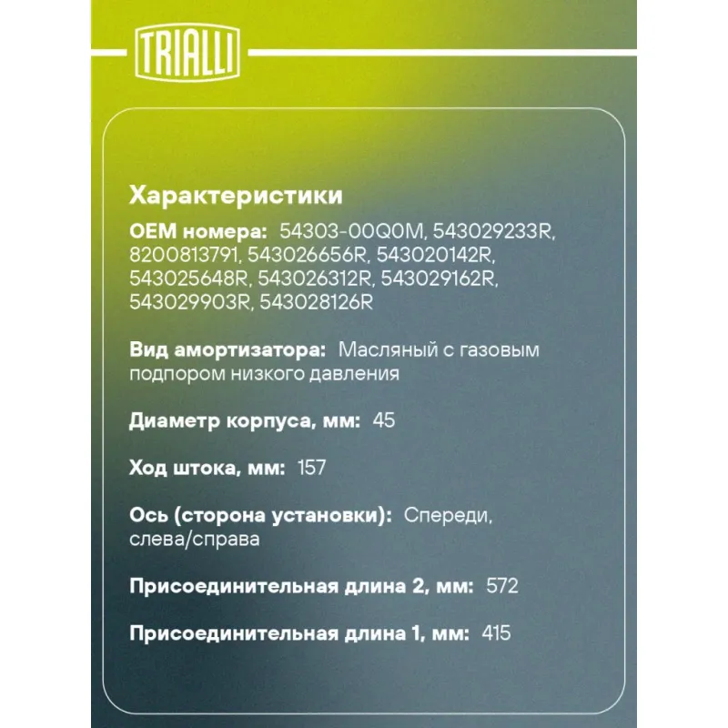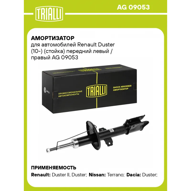 Амортизатор для автомобилей Renault Duster (10-) (стойка) передний левый / правый Описание: Амортизатор AG 09053 бренда TRIALLI служит для гашения колебаний (демпфирования) и поглощения толчков и ударов, действующих на кузов (раму) автомобиля. Особенности AG 09053: - Вид амортизатора – Масляный с газовым подпором низкого давления; - Тип амортизатора – Двухтрубный, гидравлический; Для крепления к деталям кузова автомобиля или подвески используется - верхнее крепление Шток M14x1.5; и нижнее крепление - Скоба. Амортизатор в машину (стойка) отличается от обычного амортизатора наличием специальной площадки для установки пружины подвески. Применяемость: DACIA DUSTER, NISSAN TERRANO, RENAULT DUSTER..Подбор по VIN-номеру вашего автомобиля - через кнопку 'Задать вопрос'. Специалист проверит применяемость и ответит вам. Преимущества: - Инновационная технология производства; - Контроль качества: - Дополнительная проверка с помощью 3D модели; - Сальник NOK; - Проверка каждой позиции по чертежам; - Высокоэффективная система проектирования; Амортизаторы автомобильные существенно влияют на комфорт вождения, поглощая удары и вибрации от неровностей дороги, что делает поездку более плавной и приятной.Регулярная проверка и своевременное обслуживание амортизаторов помогут продлить их срок службы и обеспечить надёжную работу. Характеристики: Артикул: AG 09053 OEM номера: 543029233R , 8200813791, 543026656R, 543020142R, 543025648R, 543026312R, 543029162R, 543029903R, 543028126R, 54303-00Q0M Товарная линейка: BLACK Количество на автомобиль: 2 Вид амортизатора: Масляный с газовым подпором низкого давления Тип верхнего крепления: Шток Тип нижнего крепления: Скоба Диаметр корпуса, мм: 45 Диаметр штока, мм: 20 Ход штока, мм: 157 Размер резьбы штока: M14x1.5 Тип амортизатора: Двухтрубный, гидравлический Ось (сторона установки): Спереди, слева/справа Присоединительная длина 2, мм: 572 Сопутствующий товар: Опоры передних стоек: SA 0159 Присоединительная длина 1, мм: 415 Сопутствующий товар: Ремонтные комплекты амортизаторов: BCS 0105, BC 1848, BCS 1848,BC 0156, BCS 0156, BCS 1866 Сопутствующий товар: Амортизаторы: AG 09503; AG 09504 Гарантийный срок: 2 года/60 000 км Подходит для авто: Renault Duster II (21-), Duster (10-) Nissan Terrano (14-) Dacia Duster (10-) Для проверки применяемости отправьте VIN автомобиля через вкладку "Есть вопросы о товаре?" Комплектация: Амортизатор (стойка) передний - 1 шт Гайка крепежная - 1 шт Гарантия: от 1 года.