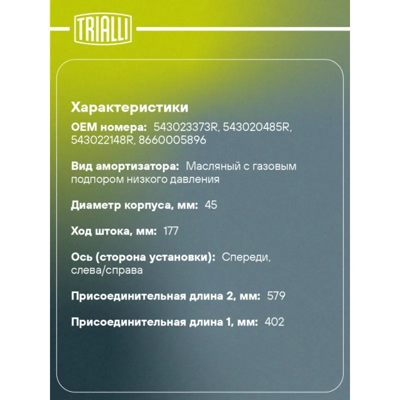 Амортизатор для автомобилей Renault Kaptur (16-) (стойка) передний левый / правый Описание: Амортизатор AG 09066 бренда TRIALLI – это устройство для гашения колебаний (демпфирования) и поглощения толчков и ударов, действующих на раму. Особенности AG 09066: - Вид – Масляный с газовым подпором низкого давления; - Тип – Двухтрубный, гидравлический; Для крепления к деталям кузова или подвески используются крепления: верхнее Шток M14x1.5; и нижнее Скоба. Амортизатор в машину (стойка) имеет специальную площадку для установки пружины подвески. Совместим с: RENAULT CAPTUR, KAPTUR.Подбор по VIN-номеру вашего автомобиля - через кнопку 'Задать вопрос'. Специалист проверит применяемость и ответит вам. Преимущества: - Инновационная технология производства; - Контроль качества каждой позиции по чертежам и с помощью 3D модели; - Сальник NOK; - Высокоэффективная система проектирования; - Гарантия до двух лет или 60 000 км пробега; Амортизаторы автомобильные существенно влияют на комфорт вождения, сокращая вибрации от неровностей дороги, что делает поездку более плавной и приятной. Регулярное и своевременное обслуживание амортизаторов помогут продлить их срок службы и обеспечить надёжную работу. Характеристики: Артикул: AG 09066 OEM номера: 543023373R, 543020485R, 543022148R, 8660005896 Товарная линейка: BLACK Количество на автомобиль: 2 Вид амортизатора: Масляный с газовым подпором низкого давления Тип верхнего крепления: Шток Тип нижнего крепления: Скоба Диаметр корпуса, мм: 45 Диаметр штока, мм: 20 Ход штока, мм: 177 Размер резьбы штока: M14x1.5 Тип амортизатора: Двухтрубный, гидравлический Ось (сторона установки): Спереди, слева/справа Присоединительная длина 2, мм: 579 Сопутствующий товар: Опоры передних стоек: SA 0159 Присоединительная длина 1, мм: 402 Сопутствующий товар: Ремонтные комплекты амортизаторов: BC 1866, BCS 1866 Сопутствующий товар: Амортизаторы: AG 09521; AG 09522 Гарантийный срок: 2 года/60 000 км Комплектация: Амортизатор (стойка) передний - 1 шт Гайка крепежная - 1 шт Гарантия: от 1 года.