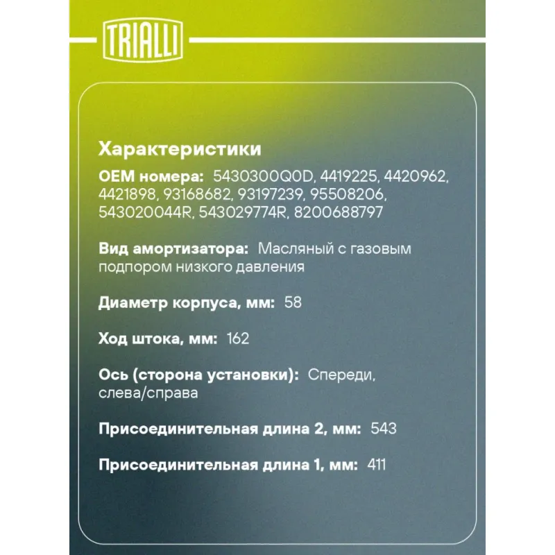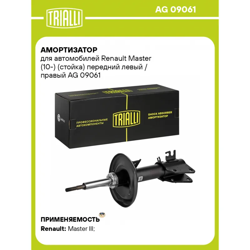 Амортизатор для автомобилей Renault Master (10-) (стойка) передний левый / правый Описание: Амортизатор AG 09061 бренда TRIALLI – это устройство для гашения колебаний (демпфирования) и поглощения толчков и ударов, действующих на раму. Особенности AG 09061: - Вид – Масляный с газовым подпором низкого давления; - Тип – Двухтрубный, гидравлический; Для крепления к деталям кузова или подвески используются крепления: верхнее Шток M14x1.5; и нижнее Скоба. Амортизатор в машину (стойка) имеет специальную площадку для установки пружины подвески. Совместим с: RENAULT MASTER.Подбор по VIN-номеру вашего автомобиля - через кнопку 'Задать вопрос'. Специалист проверит применяемость и ответит вам. Преимущества: - Инновационная технология производства; - Контроль качества каждой позиции по чертежам и с помощью 3D модели; - Сальник NOK; - Высокоэффективная система проектирования; - Гарантия до двух лет или 60 000 км пробега; Амортизаторы автомобильные существенно влияют на комфорт вождения, сокращая вибрации от неровностей дороги, что делает поездку более плавной и приятной. Регулярное и своевременное обслуживание амортизаторов помогут продлить их срок службы и обеспечить надёжную работу. Характеристики: Артикул: AG 09061 OEM номера: 5430300Q0D, 4419225, 4420962, 4421898, 93168682, 93197239, 95508206, 543020044R, 543029774R, 8200688797 Товарная линейка: BLACK Количество на автомобиль: 2 Вид амортизатора: Масляный с газовым подпором низкого давления Тип верхнего крепления: Шток Тип нижнего крепления: Скоба Диаметр корпуса, мм: 58 Диаметр штока, мм: 28 Ход штока, мм: 162 Размер резьбы штока: M14x1.5 Тип амортизатора: Двухтрубный, гидравлический Ось (сторона установки): Спереди, слева/справа Дополнительная информация: Для а/м с односкатными колёсами Присоединительная длина 2, мм: 543 Присоединительная длина 1, мм: 411 Сопутствующий товар: Амортизаторы: AG 09515, AG 09513 Гарантийный срок: 2 года/60 000 км Подходит для авто: Renault Master III (10-) Для проверки применяемости отправьте VIN автомобиля через вкладку "Есть вопросы о товаре?" Комплектация: Амортизатор (стойка) передний - 1 шт Гайка крепежная - 1 шт Гарантия: от 1 года.