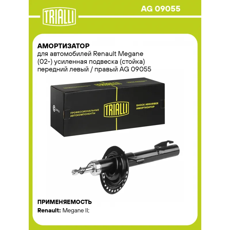 Амортизатор для автомобилей Renault Megane (02-) усиленная подвеска (стойка) передний левый / правый Описание: Амортизатор AG 09055 бренда TRIALLI – это устройство для гашения колебаний (демпфирования) и поглощения толчков и ударов, действующих на раму. Особенности AG 09055: - Вид – Масляный с газовым подпором низкого давления; - Тип – Двухтрубный, гидравлический; Для крепления к деталям кузова или подвески используются крепления: верхнее Шток M12x1.25; и нижнее Зажим. Амортизатор в машину (стойка) имеет специальную площадку для установки пружины подвески. Совместим с: RENAULT MEGANE.Подбор по VIN-номеру вашего автомобиля - через кнопку 'Задать вопрос'. Специалист проверит применяемость и ответит вам. Преимущества: - Инновационная технология производства; - Контроль качества каждой позиции по чертежам и с помощью 3D модели; - Сальник NOK; - Высокоэффективная система проектирования; - Гарантия до двух лет или 60 000 км пробега; Амортизаторы автомобильные существенно влияют на комфорт вождения, сокращая вибрации от неровностей дороги, что делает поездку более плавной и приятной. Регулярное и своевременное обслуживание амортизаторов помогут продлить их срок службы и обеспечить надёжную работу. Характеристики: Артикул: AG 09055 OEM номера: 2200222457, 8200122218, 8200222460, 8200222461, 8200278971, 8200278972, 8200335195, 8200663654 Товарная линейка: BLACK Количество на автомобиль: 2 Вид амортизатора: Масляный с газовым подпором низкого давления Тип верхнего крепления: Шток Тип нижнего крепления: Зажим Диаметр корпуса, мм: 45 Диаметр штока, мм: 20 Ход штока, мм: 140 Размер резьбы штока: M12x1.25 Тип амортизатора: Двухтрубный, гидравлический Ось (сторона установки): Спереди, слева/справа Дополнительная информация: Дла а/м со усиленной ходовой Присоединительная длина 2, мм: 478 Присоединительная длина 1, мм: 338 Сопутствующий товар: Амортизаторы: AG 09054, AG 09505, AG 09506 Гарантийный срок: 2 года/60 000 км Подходит для авто: Renault Megane II (02-), Megane II (02-) Для проверки применяемости отправьте VIN автомобиля через вкладку "Есть вопросы о товаре?" Комплектация: Амортизатор (стойка) передний - 1 шт Гайка крепежная - 1 шт Гарантия: от 1 года.