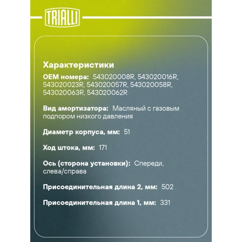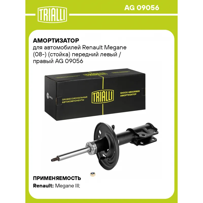 Амортизатор для автомобилей Renault Megane (08-) (стойка) передний левый / правый Описание: Амортизатор AG 09056 бренда TRIALLI – это устройство для гашения колебаний (демпфирования) и поглощения толчков и ударов, действующих на раму. Особенности AG 09056: - Вид – Масляный с газовым подпором низкого давления; - Тип – Двухтрубный, гидравлический; Для крепления к деталям кузова или подвески используются крепления: верхнее Шток M12x1.25; и нижнее Скоба. Амортизатор в машину (стойка) имеет специальную площадку для установки пружины подвески. Совместим с: RENAULT MEGANE.Подбор по VIN-номеру вашего автомобиля - через кнопку 'Задать вопрос'. Специалист проверит применяемость и ответит вам. Преимущества: - Инновационная технология производства; - Контроль качества каждой позиции по чертежам и с помощью 3D модели; - Сальник NOK; - Высокоэффективная система проектирования; - Гарантия до двух лет или 60 000 км пробега; Амортизаторы автомобильные существенно влияют на комфорт вождения, сокращая вибрации от неровностей дороги, что делает поездку более плавной и приятной. Регулярное и своевременное обслуживание амортизаторов помогут продлить их срок службы и обеспечить надёжную работу. Характеристики: Артикул: AG 09056 OEM номера: 543020008R, 543020016R, 543020023R, 543020057R, 543020058R, 543020063R, 543020062R Товарная линейка: BLACK Количество на автомобиль: 2 Вид амортизатора: Масляный с газовым подпором низкого давления Тип верхнего крепления: Шток Тип нижнего крепления: Скоба Диаметр корпуса, мм: 51 Диаметр штока, мм: 22 Ход штока, мм: 171 Размер резьбы штока: M12x1.25 Тип амортизатора: Двухтрубный, гидравлический Ось (сторона установки): Спереди, слева/справа Дополнительная информация: Упаковка изделия может отличаться от представленной на фото Присоединительная длина 2, мм: 502 Присоединительная длина 1, мм: 331 Сопутствующий товар: Ремонтные комплекты амортизаторов: BC 1948, BC 1966, BCS 2066 Сопутствующий товар: Амортизаторы: AG 09507 Гарантийный срок: 2 года/60 000 км Подходит для авто: Renault Megane III (08-), Megane III (08-) Для проверки применяемости отправьте VIN автомобиля через вкладку "Есть вопросы о товаре?" Комплектация: Амортизатор (стойка) передний - 1 шт Гайка крепежная - 1 шт Гарантия: от 1 года.