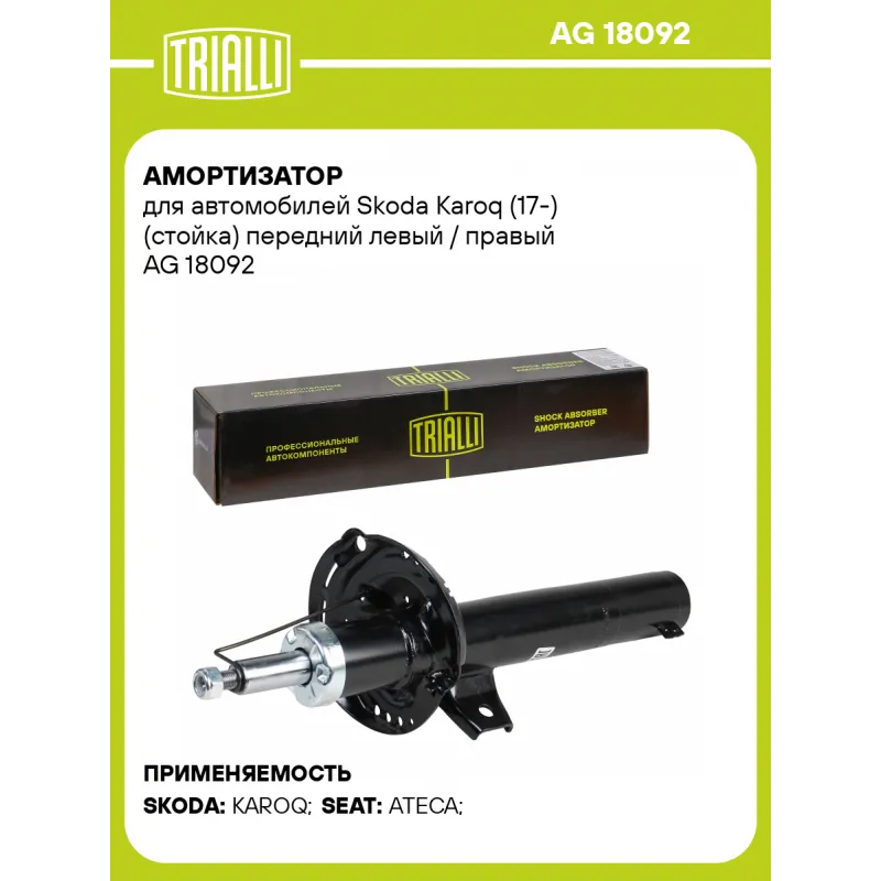 Амортизатор для автомобилей Skoda Karoq (17-) (стойка) передний левый / правый Описание: Амортизатор AG 18092 бренда TRIALLI – это устройство для гашения колебаний (демпфирования) и поглощения толчков и ударов, действующих на раму. Особенности AG 18092: - Вид – Масляный с газовым подпором низкого давления; - Тип – Двухтрубный, гидравлический; Для крепления к деталям кузова или подвески используются крепления: верхнее Шток M14x1,5; и нижнее Корпус. Амортизатор в машину (стойка) имеет специальную площадку для установки пружины подвески. Совместим с: SEAT ATECA, SKODA KAROQ.Подбор по VIN-номеру вашего автомобиля - через кнопку 'Задать вопрос'. Специалист проверит применяемость и ответит вам. Преимущества: - Инновационная технология производства; - Контроль качества каждой позиции по чертежам и с помощью 3D модели; - Сальник NOK; - Высокоэффективная система проектирования; - Гарантия до двух лет или 60 000 км пробега; Амортизаторы автомобильные существенно влияют на комфорт вождения, сокращая вибрации от неровностей дороги, что делает поездку более плавной и приятной. Регулярное и своевременное обслуживание амортизаторов помогут продлить их срок службы и обеспечить надёжную работу. Характеристики: Артикул: AG 18092 OEM номера: 5Q3 413 031 J, 5Q3 413 031 K, 5Q3 413 031 H, 5Q3 413 031 L Товарная линейка: BLACK Количество на автомобиль: 2 Вид амортизатора: Масляный с газовым подпором низкого давления Тип верхнего крепления: Шток Тип нижнего крепления: Корпус Диаметр корпуса, мм: 55 Диаметр штока, мм: 25 Ход штока, мм: 177 Размер резьбы штока: M14x1,5 Тип амортизатора: Двухтрубный, гидравлический Ось (сторона установки): Спереди, слева/справа Дополнительная информация: Упаковка изделия может отличаться от представленной на фото Присоединительная длина 2, мм: 551 Присоединительная длина 1, мм: 374 Сопутствующий товар: Амортизаторы: AG 18525 Гарантийный срок: 2 года/60 000 км Комплектация: Гайка крепежная - 1 шт Амортизатор передний - 1 шт Гарантия: от 1 года.