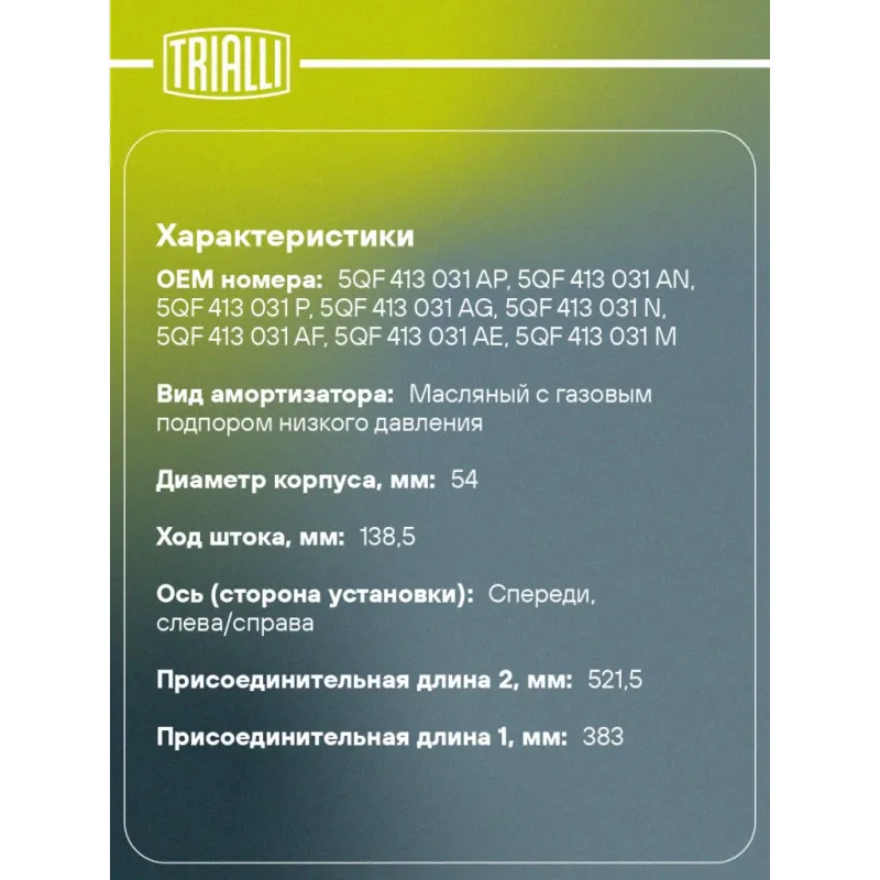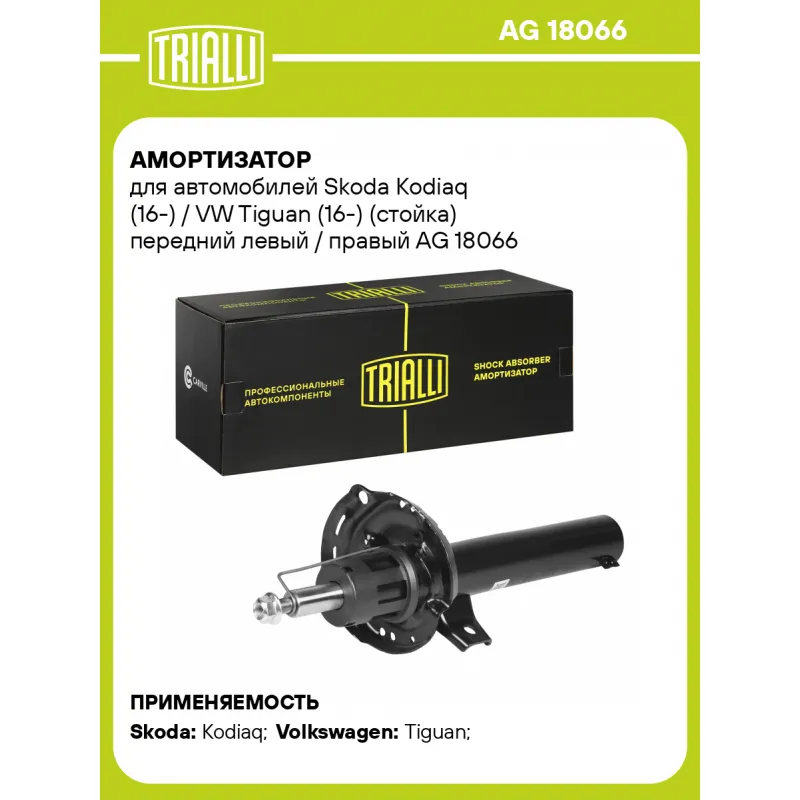 Амортизатор для автомобилей Skoda Kodiaq (16-) / VW Tiguan (16-) (стойка) передний левый / правый Описание: Амортизатор AG 18066 бренда TRIALLI – это устройство для гашения колебаний (демпфирования) и поглощения толчков и ударов, действующих на раму. Особенности AG 18066: - Вид – Масляный с газовым подпором низкого давления; - Тип – Двухтрубный, гидравлический; Для крепления к деталям кузова или подвески используются крепления: верхнее Шток M14x1.5; и нижнее Кронштейн. Амортизатор в машину (стойка) имеет специальную площадку для установки пружины подвески. Совместим с: SKODA FABIA, KODIAQ, SKODA (SVW) KODIAQ, VW TIGUAN.Подбор по VIN-номеру вашего автомобиля - через кнопку 'Задать вопрос'. Специалист проверит применяемость и ответит вам. Преимущества: - Инновационная технология производства; - Контроль качества каждой позиции по чертежам и с помощью 3D модели; - Сальник NOK; - Высокоэффективная система проектирования; - Гарантия до двух лет или 60 000 км пробега; Амортизаторы автомобильные существенно влияют на комфорт вождения, сокращая вибрации от неровностей дороги, что делает поездку более плавной и приятной. Регулярное и своевременное обслуживание амортизаторов помогут продлить их срок службы и обеспечить надёжную работу. Характеристики: Артикул: AG 18066 OEM номера: 5QF 413 031 AP, 5QF 413 031 AN, 5QF 413 031 P, 5QF 413 031 AG, 5QF 413 031 N, 5QF 413 031 AF, 5QF 413 031 AE, 5QF 413 031 M Товарная линейка: BLACK Количество на автомобиль: 2 Вид амортизатора: Масляный с газовым подпором низкого давления Тип верхнего крепления: Шток Тип нижнего крепления: Кронштейн Диаметр корпуса, мм: 54 Диаметр штока, мм: 25 Ход штока, мм: 138.5 Размер резьбы штока: M14x1.5 Тип амортизатора: Двухтрубный, гидравлический Ось (сторона установки): Спереди, слева/справа Дополнительная информация: Упаковка изделия может отличаться от представленной на фото Присоединительная длина 2, мм: 521.5 Присоединительная длина 1, мм: 383 Гарантийный срок: 2 года/60 000 км Подходит для авто: Skoda Kodiaq (16-), Kodiaq (16-) Volkswagen Tiguan (16-) Для проверки применяемости отправьте VIN автомобиля через вкладку "Есть вопросы о товаре?" Комплектация: Амортизатор (стойка) передний - 1 шт Гайка крепежная - 1 шт Гарантия: от 1 года.