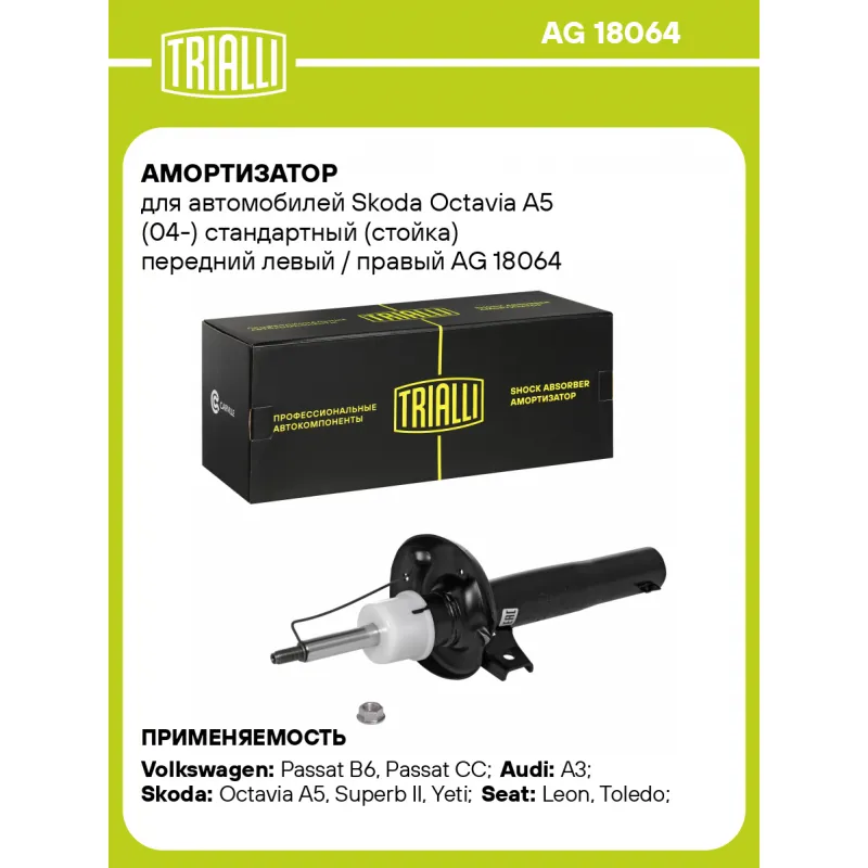 Амортизатор для автомобилей Skoda Octavia A5 (04-) стандартный (стойка) передний левый / правый Описание: Амортизатор AG 18064 бренда TRIALLI – это устройство для гашения колебаний (демпфирования) и поглощения толчков и ударов, действующих на раму. Особенности AG 18064: - Вид – Масляный с газовым подпором низкого давления; - Тип – Двухтрубный, гидравлический; Для крепления к деталям кузова или подвески используются крепления: верхнее Шток M14x1.5; и нижнее Зажим. Амортизатор в машину (стойка) имеет специальную площадку для установки пружины подвески. Совместим с: AUDI A3, SEAT TOLEDO, ALTEA, LEON, SKODA OCTAVIA, YETI, SUPERB, VW JETTA, GOLF, GOLF PLUS, CADDY, BEETLE, CC, PASSAT, TOURAN, SHARAN, SCIROCCO.Подбор по VIN-номеру вашего автомобиля - через кнопку 'Задать вопрос'. Специалист проверит применяемость и ответит вам. Преимущества: - Инновационная технология производства; - Контроль качества каждой позиции по чертежам и с помощью 3D модели; - Сальник NOK; - Высокоэффективная система проектирования; - Гарантия до двух лет или 60 000 км пробега; Амортизаторы автомобильные существенно влияют на комфорт вождения, сокращая вибрации от неровностей дороги, что делает поездку более плавной и приятной. Регулярное и своевременное обслуживание амортизаторов помогут продлить их срок службы и обеспечить надёжную работу. Характеристики: Артикул: AG 18064 OEM номера: 1K0413031AC, 1K0413031AD, 1K0413031AE, 1K0413031AF, 1K0413031AH, 1K0413031AJ, 1K0413031AP, 1K0413031AQ, 1K0413031AR, 1K0413031AS, 1K0413031AT, 1K0413031BA, 1K0413031BB, 1K0413031BC, 1K0413031BE, 1K0413031BF, 1K0413031BG, 1K0413031BH, 1K0413031BJ, 1K0413031BK, 1K0413031BL, 1K0413031BS, 1K0413031BT, 1K0413031CH, 1K0413031CJ, 1K0413031CK, 1K0413031CL, 1K0413031CM, 1K0413031CN, 1K0413031CP, 1K0413031CQ, 1K0413031CR, 1K0413031CS, 1K0413031CT, 1K0413031DA, 1K0513031BT, 5C0413031AH, 5C0413031AJ, 5C0413031AM, 5C0413031AN, 5C0413031AQ, 5C0413031AR, 5C0413031AS, 5C0413031BR, 5C0413031BS, 5C0413031BT, 5C0413031F, 5C0413031G, 5C0413031J, 5Z0413031C, 5Z0413031L, 6Q0413031AH, 6Q0413031BN, 6Q0413031CD, 6Q0413031CE, 6Q0513031BN, 8Z0413031S Товарная линейка: BLACK Количество на автомобиль: 2 Вид амортизатора: Масляный с газовым подпором низкого давления Тип верхнего крепления: Шток Тип нижнего крепления: Зажим Диаметр корпуса, мм: 50 Диаметр штока, мм: 22 Ход штока, мм: 163 Размер резьбы штока: M14x1.5 Тип амортизатора: Двухтрубный, гидравлический Ось (сторона установки): Спереди, слева/справа Дополнительная информация: Для а/м со стандартной подвеской Присоединительная длина 2, мм: 539 Сопутствующий товар: Опоры передних стоек: SA 1852; SA 1863 Присоединительная длина 1, мм: 376 Сопутствующий товар: Ремонтные комплекты амортизаторов: BC 1948, BCS 2048 Сопутствующий товар: Амортизаторы: AG 18050, AG 18507, AG 18518 Гарантийный срок: 2 года/60 000 км Подходит для авто: Volkswagen Passat B6 (05-), Passat CC (08-), Passat CC (08-), Passat CC (08-), Golf VI (08-), Golf Plus (05-), Jetta (05-), Jetta (11-), Scirocco (08-), Sharan (10-), Touran (03-), Passat B6 (05-), Passat B7 (10-), Caddy (04-), Golf V (03-), Golf VI (08-), Jetta (05-), Touran (03-) Audi A3 (03-), A3 (03-) Skoda Octavia A5 (04-), Superb II (08-), Yeti (09-), Octavia A5 (04-), Yeti (09-) Seat Leon (05-), Leon (05-), Toledo (04-) Для проверки применяемости отправьте VIN автомобиля через вкладку "Есть вопросы о товаре?" Комплектация: Амортизатор (стойка) передний - 1 шт Гайка крепежная - 1 шт Гарантия: от 1 года.