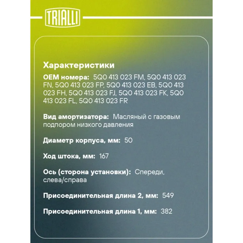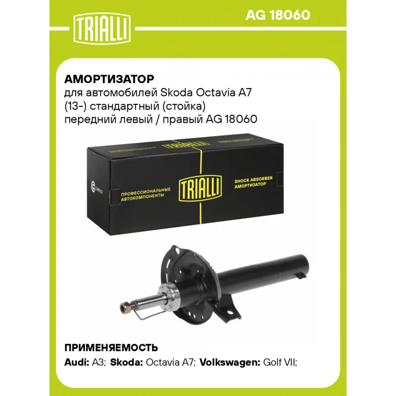Амортизатор для автомобилей Skoda Octavia A7 (13-) стандартный (стойка) передний левый / правый Описание: Амортизатор AG 18060 бренда TRIALLI – это устройство для гашения колебаний (демпфирования) и поглощения толчков и ударов, действующих на раму. Особенности AG 18060: - Вид – Масляный с газовым подпором низкого давления; - Тип – Двухтрубный, гидравлический; Для крепления к деталям кузова или подвески используются крепления: верхнее Шток M14x1,5; и нижнее Зажим. Амортизатор в машину (стойка) имеет специальную площадку для установки пружины подвески. Совместим с: AUDI A3, SEAT LEON, SKODA OCTAVIA, VW GOLF.Подбор по VIN-номеру вашего автомобиля - через кнопку 'Задать вопрос'. Специалист проверит применяемость и ответит вам. Преимущества: - Инновационная технология производства; - Контроль качества каждой позиции по чертежам и с помощью 3D модели; - Сальник NOK; - Высокоэффективная система проектирования; - Гарантия до двух лет или 60 000 км пробега; Амортизаторы автомобильные существенно влияют на комфорт вождения, сокращая вибрации от неровностей дороги, что делает поездку более плавной и приятной. Регулярное и своевременное обслуживание амортизаторов помогут продлить их срок службы и обеспечить надёжную работу. Характеристики: Артикул: AG 18060 OEM номера: 5Q0 413 023 FM, 5Q0 413 023 FN, 5Q0 413 023 FP, 5Q0 413 023 EB, 5Q0 413 023 FH, 5Q0 413 023 FJ, 5Q0 413 023 FK, 5Q0 413 023 FL, 5Q0 413 023 FR, 5Q0 413 023 DR, 5Q0 413 023 FQ, 8V0 413 023 C, 8V0 413 023 D, 5Q0413023HB, 5Q0 413 023 EQ, 5Q0 413 023 ER, 5Q0 413 023 CP, 5Q0 413 023 DA, 5Q0 413 023 DB, 5Q0 413 023 DQ, 5QM 413 023 AK, 5QM 413 023 AL, 5QM 413 023 AN, 5QM 413 023 K, 5QM 413 023 P, 5Q0 413 023 EP, 5QM 413 023 AB, 5QM 413 023 AC, 5QM 413 023 AD, 5QM 413 023 AE, 5QM 413 023 AF, 5QM 413 023 AJ Товарная линейка: BLACK Количество на автомобиль: 2 Вид амортизатора: Масляный с газовым подпором низкого давления Тип верхнего крепления: Шток Тип нижнего крепления: Зажим Диаметр корпуса, мм: 50 Диаметр штока, мм: 22 Ход штока, мм: 167 Размер резьбы штока: M14x1,5 Тип амортизатора: Двухтрубный, гидравлический Ось (сторона установки): Спереди, слева/справа Дополнительная информация: Для а/м со стандартной подвеской Присоединительная длина 2, мм: 549 Присоединительная длина 1, мм: 382 Сопутствующий товар: Ремонтные комплекты амортизаторов: BC 1948, BCS 2048 Сопутствующий товар: Амортизаторы: AG 18065; AG 18522; AG 18515 Гарантийный срок: 2 года/60 000 км Подходит для авто: Audi A3 (12-) Skoda Octavia A7 (13-) Volkswagen Golf VII (12-) Для проверки применяемости отправьте VIN автомобиля через вкладку "Есть вопросы о товаре?" Комплектация: Амортизатор (стойка) передний - 1 шт Гайка крепежная - 1 шт Гарантия: от 1 года.