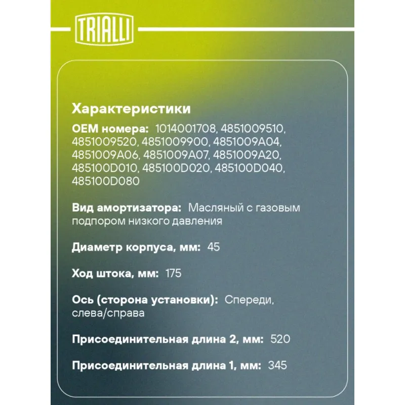 Амортизатор для автомобилей Toyota Yaris (99-) / Geely MK (08-) (стойка) передний левый / правый Описание: Амортизатор AG 19074 бренда TRIALLI – это устройство для гашения колебаний (демпфирования) и поглощения толчков и ударов, действующих на раму. Особенности AG 19074: - Вид – Масляный с газовым подпором низкого давления; - Тип – Двухтрубный, гидравлический; Для крепления к деталям кузова или подвески используются крепления: верхнее Шток M12x1.25; и нижнее Скоба. Амортизатор в машину (стойка) имеет специальную площадку для установки пружины подвески. Совместим с: TOYOTA YARIS.Подбор по VIN-номеру вашего автомобиля - через кнопку 'Задать вопрос'. Специалист проверит применяемость и ответит вам. Преимущества: - Инновационная технология производства; - Контроль качества каждой позиции по чертежам и с помощью 3D модели; - Сальник NOK; - Высокоэффективная система проектирования; - Гарантия до двух лет или 60 000 км пробега; Амортизаторы автомобильные существенно влияют на комфорт вождения, сокращая вибрации от неровностей дороги, что делает поездку более плавной и приятной. Регулярное и своевременное обслуживание амортизаторов помогут продлить их срок службы и обеспечить надёжную работу. Характеристики: Артикул: AG 19074 OEM номера: 1014001708, 4851009510, 4851009520, 4851009900, 4851009A04, 4851009A06, 4851009A07, 4851009A20, 485100D010, 485100D020, 485100D040, 485100D080, 485100D100, 485100D150, 485100D160, 4851052030, 4851052032, 4851052034, 4851052040, 4851052044, 4851052063 Товарная линейка: BLACK Количество на автомобиль: 2 Вид амортизатора: Масляный с газовым подпором низкого давления Тип верхнего крепления: Шток Тип нижнего крепления: Скоба Диаметр корпуса, мм: 45 Диаметр штока, мм: 20 Ход штока, мм: 175 Размер резьбы штока: M12x1.25 Тип амортизатора: Двухтрубный, гидравлический Ось (сторона установки): Спереди, слева/справа Присоединительная длина 2, мм: 520 Присоединительная длина 1, мм: 345 Сопутствующий товар: Ремонтные комплекты амортизаторов: BC 1848, BC 1866, BCS 1848, BCS 1866 Сопутствующий товар: Амортизаторы: AG 19516 Гарантийный срок: 2 года/60 000 км Комплектация: Амортизатор передний - 1 шт Гайка крепежная - 1 шт Гарантия: от 1 года.