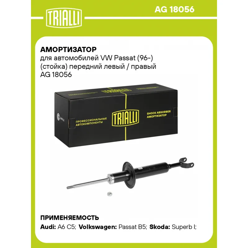 Амортизатор для автомобилей VW Passat (96-) (стойка) передний левый / правый Описание: Амортизатор AG 18056 бренда TRIALLI – это устройство для гашения колебаний (демпфирования) и поглощения толчков и ударов, действующих на раму. Особенности AG 18056: - Вид – Масляный с газовым подпором низкого давления ; - Тип – Двухтрубный, гидравлический; Для крепления к деталям кузова или подвески используются крепления: верхнее Шток M12x1.5; и нижнее Кронштейн. Амортизатор в машину (стойка) имеет специальную площадку для установки пружины подвески. Совместим с: AUDI A6, ISUZU (QINGLING) TAGA, SKODA SUPERB, ROOMSTER, VW PASSAT.Подбор по VIN-номеру вашего автомобиля - через кнопку 'Задать вопрос'. Специалист проверит применяемость и ответит вам. Преимущества: - Инновационная технология производства; - Контроль качества каждой позиции по чертежам и с помощью 3D модели; - Сальник NOK; - Высокоэффективная система проектирования; - Гарантия до двух лет или 60 000 км пробега; Амортизаторы автомобильные существенно влияют на комфорт вождения, сокращая вибрации от неровностей дороги, что делает поездку более плавной и приятной. Регулярное и своевременное обслуживание амортизаторов помогут продлить их срок службы и обеспечить надёжную работу. Характеристики: Артикул: AG 18056 OEM номера: 3B0413031Q, 3B0413031R, 3B0413031S, 4B0412031BT, 4B0412031CA, 4B0412031CB, 8D0413031BS, 3B0413031BS, 3B0413031J, 3B0413031P Товарная линейка: BLACK Количество на автомобиль: 2 Вид амортизатора: Масляный с газовым подпором низкого давления Тип верхнего крепления: Шток Тип нижнего крепления: Кронштейн Диаметр корпуса, мм: 51 Диаметр штока, мм: 15 Ход штока, мм: 146 Размер резьбы штока: M12x1.5 Тип амортизатора: Двухтрубный, гидравлический Ось (сторона установки): Спереди, слева/справа Дополнительная информация: Упаковка изделия может отличаться от представленной на фото Присоединительная длина 2, мм: 600 Присоединительная длина 1, мм: 454 Сопутствующий товар: Амортизаторы: AG 18053; AG 18055; AG 18506 Гарантийный срок: 2 года/60 000 км Подходит для авто: Audi A6 C5 (97-) Volkswagen Passat B5 (96-) Skoda Superb I (01-) Для проверки применяемости отправьте VIN автомобиля через вкладку "Есть вопросы о товаре?" Комплектация: Амортизатор (стойка) передний - 1 шт Гайка крепежная - 1 шт Гарантия: от 1 года.