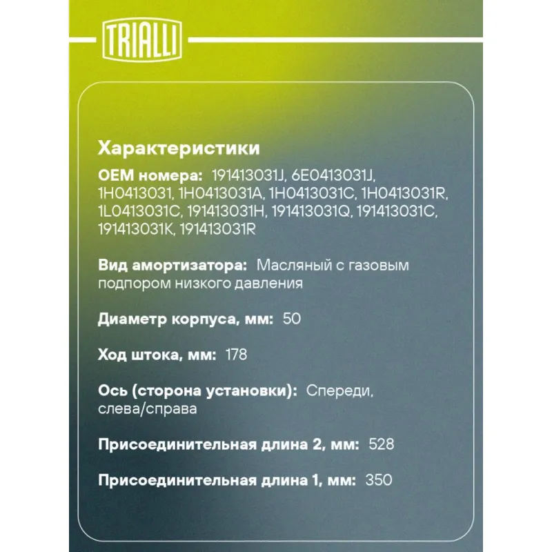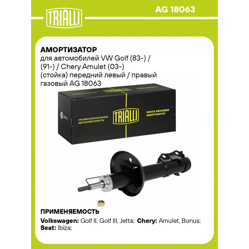 Амортизатор для автомобилей VW Golf (83-) / (91-) / Chery Amulet (03-) (стойка) передний левый / правый газовый Описание: Амортизатор AG 18063 бренда TRIALLI – это устройство для гашения колебаний (демпфирования) и поглощения толчков и ударов, действующих на раму. Особенности AG 18063: - Вид – Масляный с газовым подпором низкого давления; - Тип – Двухтрубный, гидравлический; Для крепления к деталям кузова или подвески используются крепления: верхнее Шток M14x1.5; и нижнее Скоба. Амортизатор в машину (стойка) имеет специальную площадку для установки пружины подвески. Совместим с: CHERY AMULET, BONUS, SEAT IBIZA, TOLEDO, VOLVO 850, VW VENTO, GOLF, JETTA, LUPO, POLO, CADDY.Подбор по VIN-номеру вашего автомобиля - через кнопку 'Задать вопрос'. Специалист проверит применяемость и ответит вам. Преимущества: - Инновационная технология производства; - Контроль качества каждой позиции по чертежам и с помощью 3D модели; - Сальник NOK; - Высокоэффективная система проектирования; - Гарантия до двух лет или 60 000 км пробега; Амортизаторы автомобильные существенно влияют на комфорт вождения, сокращая вибрации от неровностей дороги, что делает поездку более плавной и приятной. Регулярное и своевременное обслуживание амортизаторов помогут продлить их срок службы и обеспечить надёжную работу. Характеристики: Артикул: AG 18063 OEM номера: 191413031J, 6E0413031J, 1H0413031, 1H0413031A, 1H0413031C, 1H0413031R, 1L0413031C, 191413031H, 191413031Q, 191413031C, 191413031K, 191413031R, 6K0413031B, A11-2905010BA, 1L0413031, 1L0413031A, 1L0413031B, 1L0413031D, 1L0413031E, 6K0413031, 6K0413031A, JZW413031C, 191413031P Товарная линейка: BLACK Количество на автомобиль: 2 Вид амортизатора: Масляный с газовым подпором низкого давления Тип верхнего крепления: Шток Тип нижнего крепления: Скоба Диаметр корпуса, мм: 50 Диаметр штока, мм: 20 Ход штока, мм: 178 Размер резьбы штока: M14x1.5 Тип амортизатора: Двухтрубный, гидравлический Ось (сторона установки): Спереди, слева/справа Дополнительная информация: Упаковка изделия может отличаться от представленной на фото Присоединительная длина 2, мм: 528 Присоединительная длина 1, мм: 350 Сопутствующий товар: Ремонтные комплекты амортизаторов: BC 1866, BCS 1866 Сопутствующий товар: Амортизаторы: AH 18063,AH 18517, AG 18517 Гарантийный срок: 2 года/60 000 км Подходит для авто: Volkswagen Golf II (83-), Golf III (91-), Jetta (84-), Lupo (98-), Polo III (94-), Vento (92-) Chery Amulet (A15) (03-), Amulet (A15) (03-), Bonus (A13) (11-) Seat Ibiza (93-), Ibiza (00-), Ibiza (00-) Для проверки применяемости отправьте VIN автомобиля через вкладку "Есть вопросы о товаре?" Комплектация: Амортизатор (стойка) передний - 1 шт Гайка крепежная - 1 шт Гарантия: от 1 года.